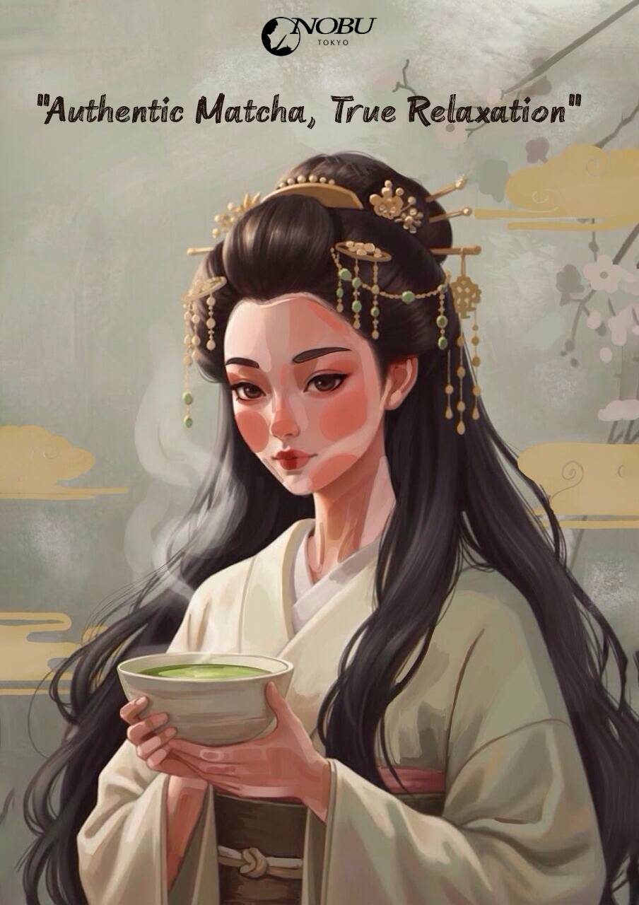 This poster focuses on the traditional matcha ritual, symbolizing authenticity and inner relaxation. The calm expression and soft colors reflect the peaceful experience of enjoying authentic Japanese matcha.