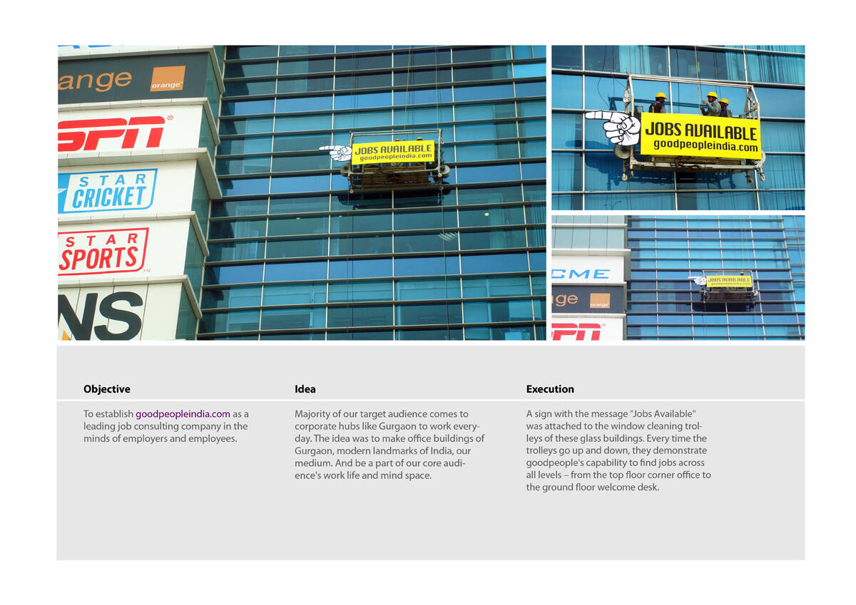 This professional campaign titled 'Jobs available' was published in India in February, 2009. It was created for the brand: goodpeopleindia, by ad agency: Euro RSCG. This Ambient medium campaign is related to the Professional Services industry and contains 1 media asset. It was submitted almost 17 years ago.