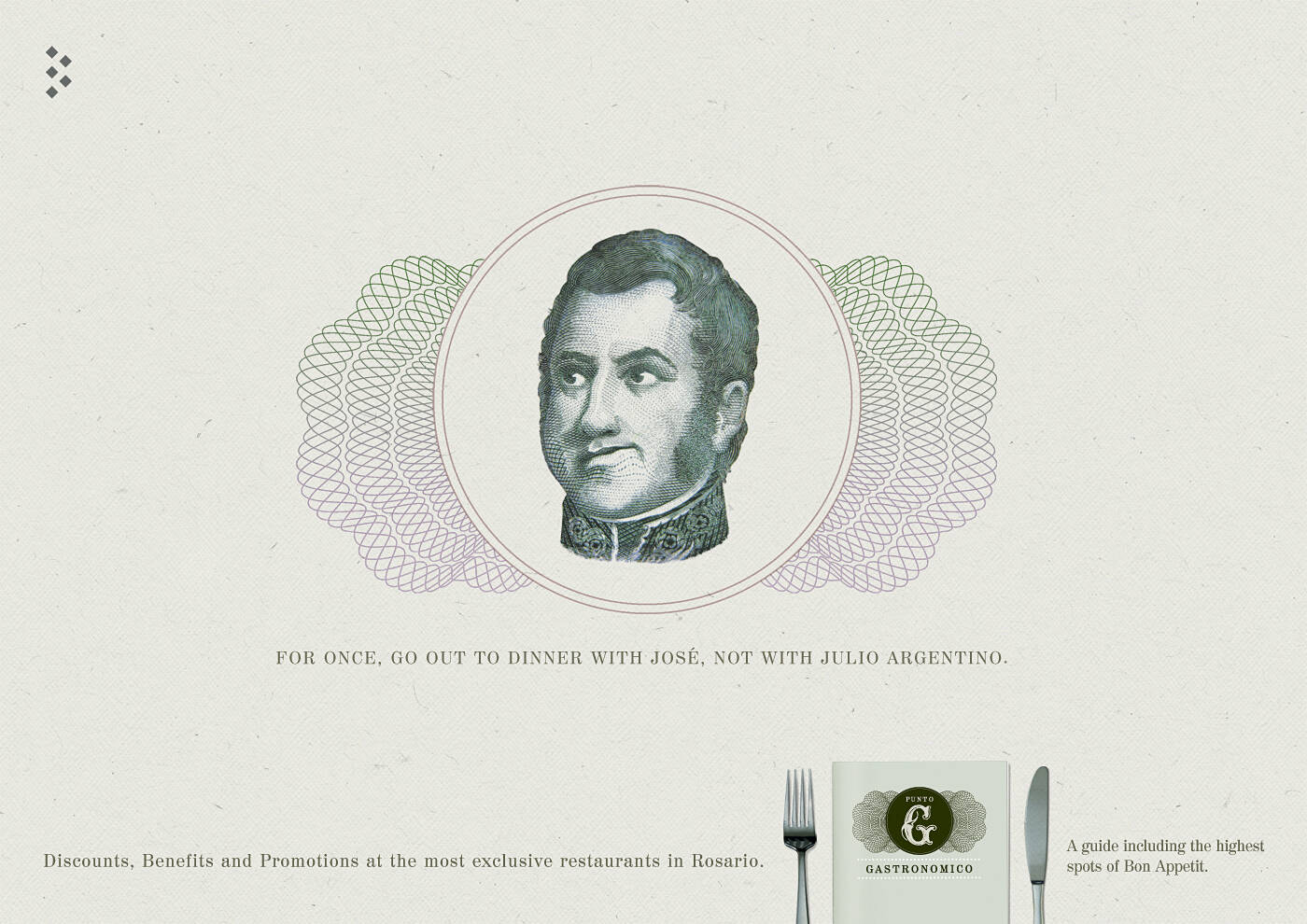 This professional campaign titled 'José, Bartolomé' was published in Argentina in July, 2010. It was created for the brand: Gastronomic G Point, by ad agency: Communion. This Print medium campaign is related to the Food industry and contains 2 media assets. It was submitted over 15 years ago.