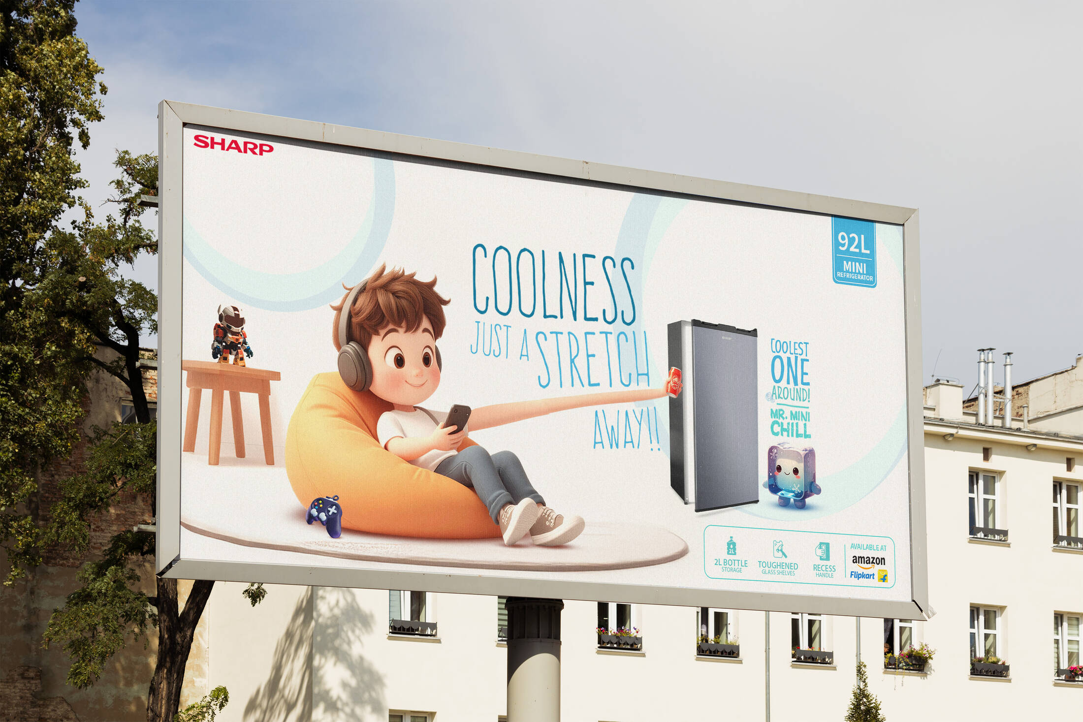 This professional campaign titled 'Just a stretch away!' was published in India in June, 2025. It was created for the brand: Sharp, by ad agency: Horizon9. This Design, OOH Outdoor, and Print media campaign is related to the Electronic Devices, Food, and Household Products industries and contains 6 media assets. It was submitted 27 minutes ago by Creative Director/ Writer: Kshitij Narain of Horizon9 Advertising & Brand Consultants Ltd..