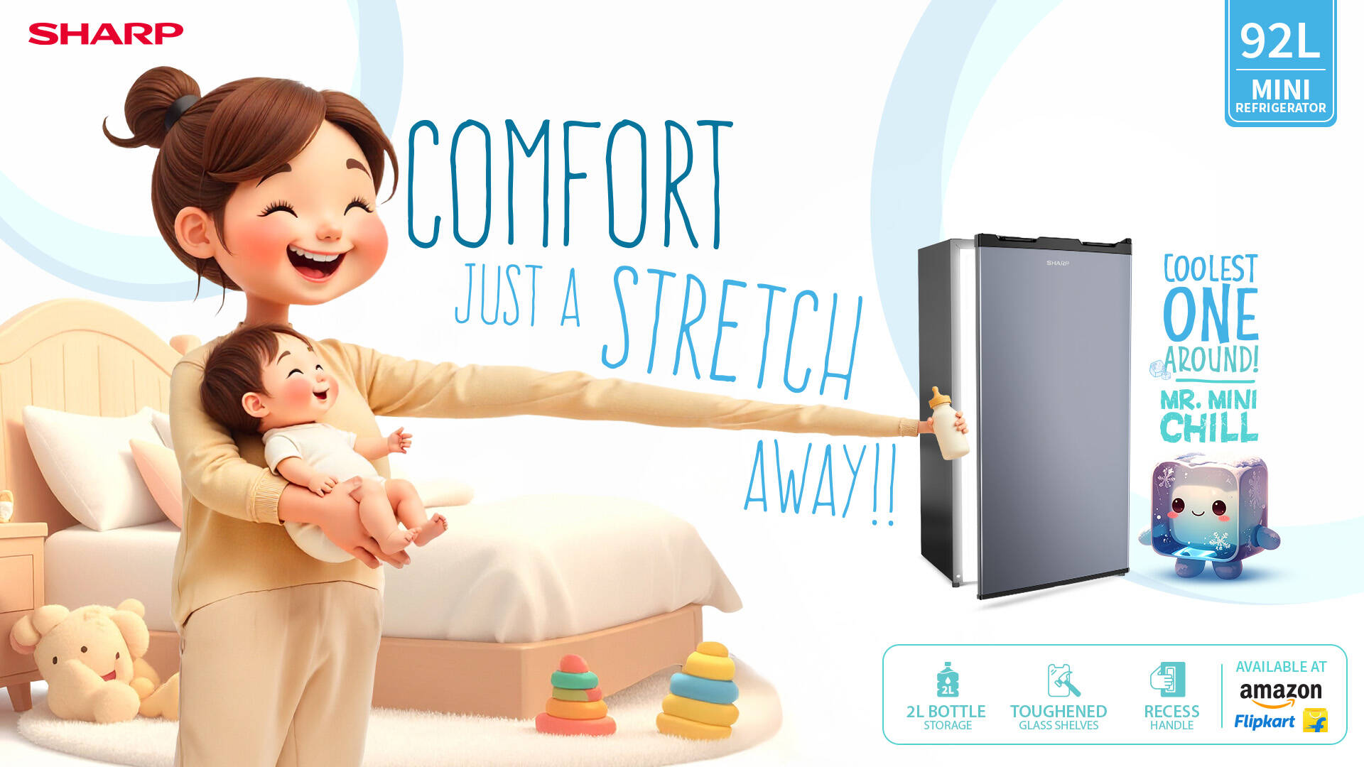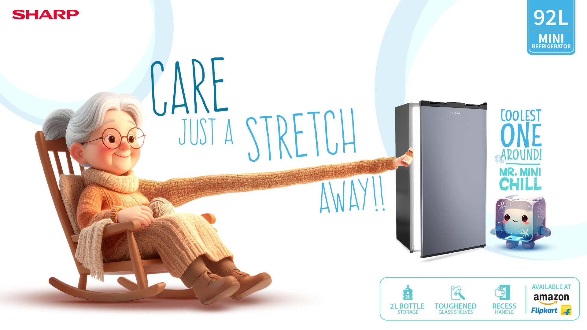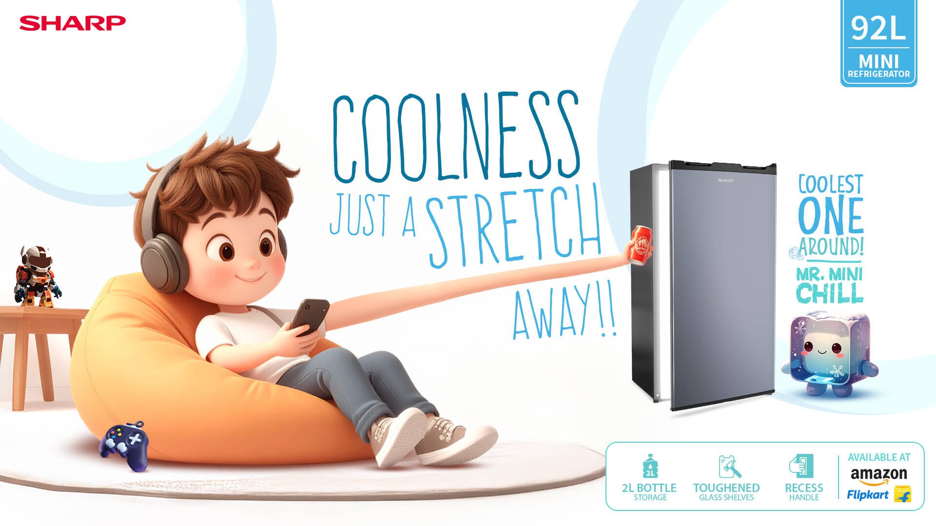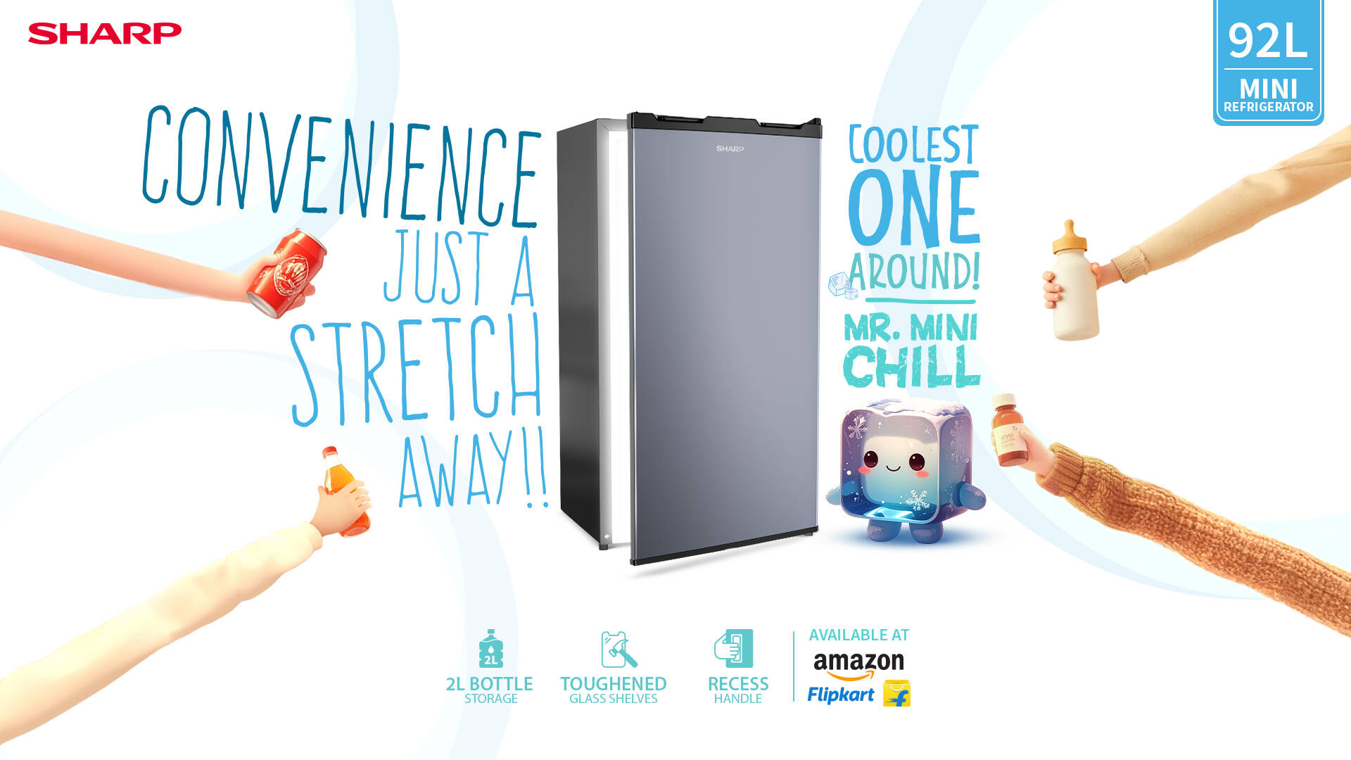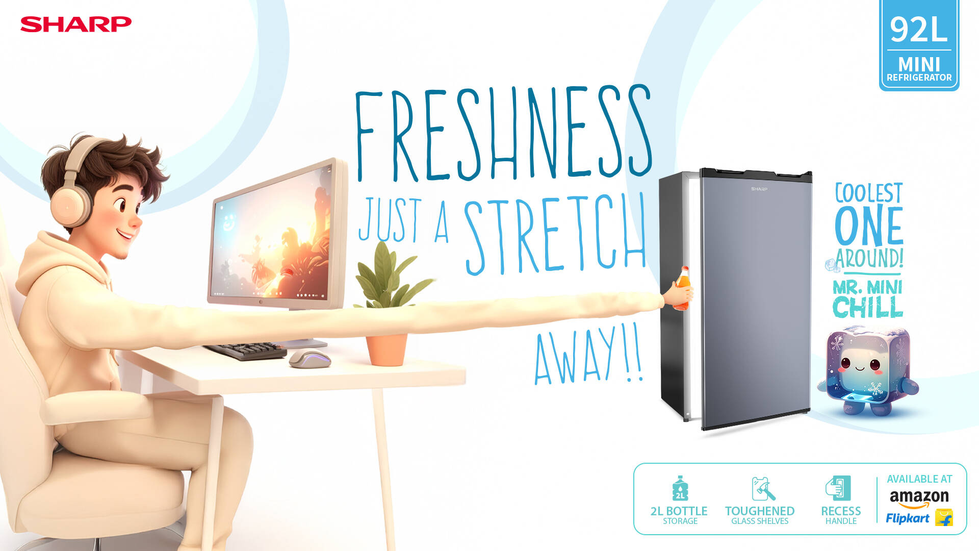With the SHARP Mini Refrigerator, everything you need is always just a stretch away. Built around real-life situations, the campaign brings alive comfort, care, coolness, and freshness—right within arm’s reach.
