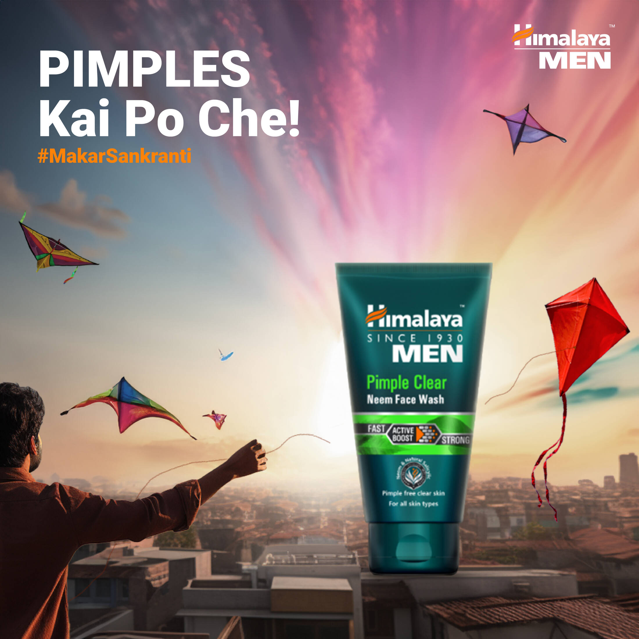 The creative depicts how Pimples will Kai Po Che (A term used during Makar Sankranti when you cut another Kite) with Himalaya Men pimple clear Neem face wash.