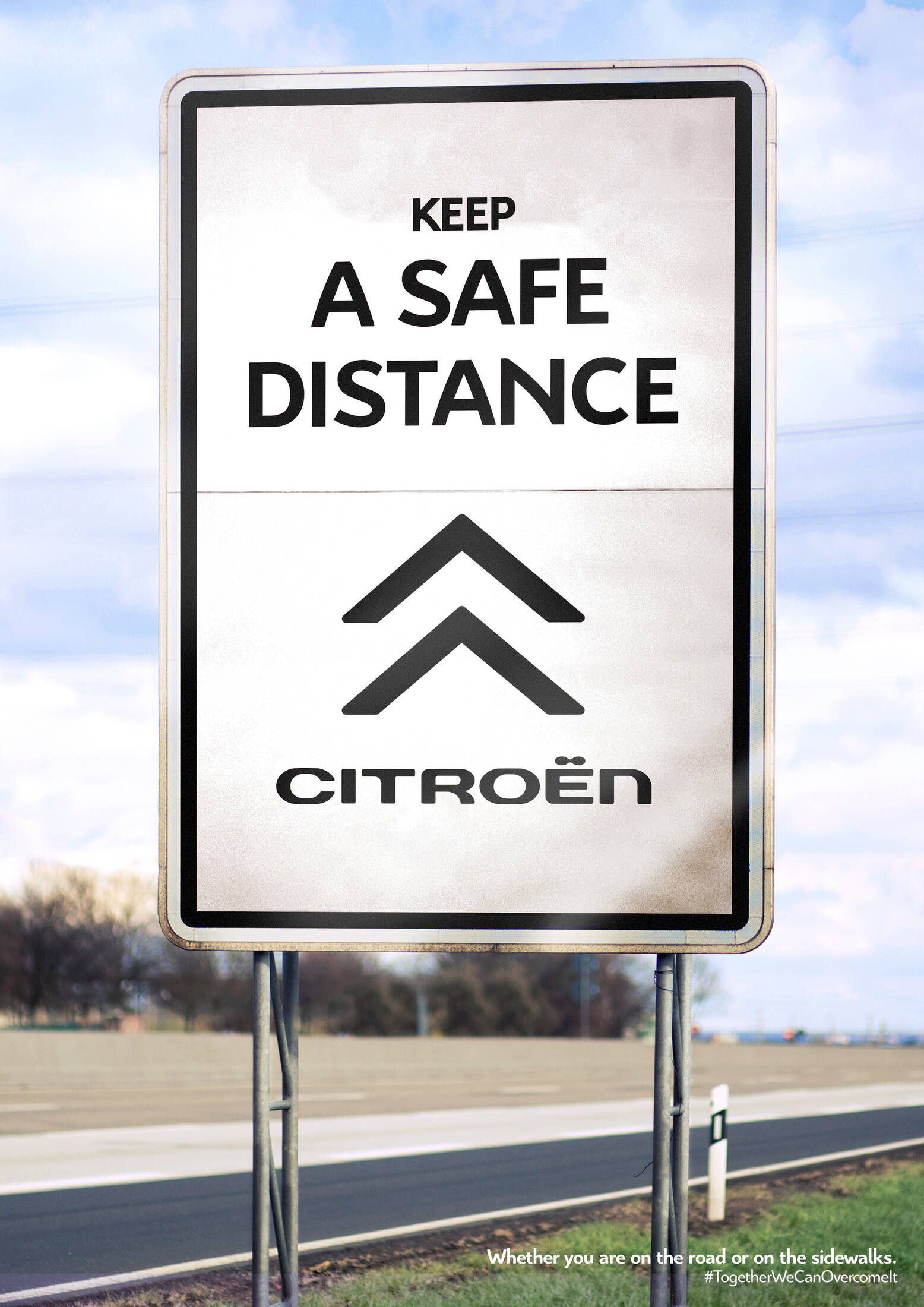 During the time of Corona crisis, we communicated social distancing via Citroën logo, resembling the highway sign “keep a safe distance”.