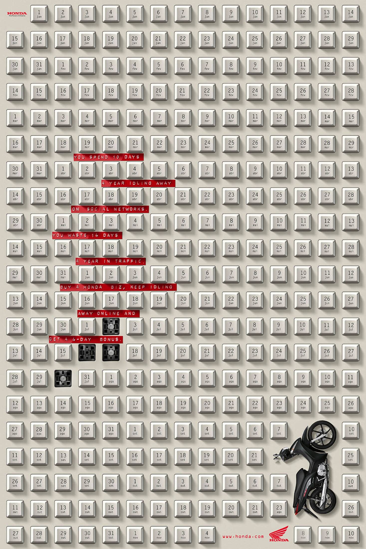 This professional campaign titled 'Keyboard, Agenda' was published in Brazil in July, 2016. It was created for the brand: Honda, by ad agency: Y&R. This Print medium campaign is related to the Automotive and Personal Transportation industry and contains 2 media assets. It was submitted over 9 years ago.