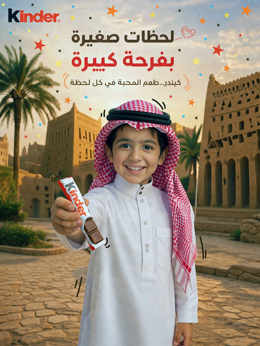 A heartwarming creative campaign for Kinder that celebrates childhood innocence and joy within a Saudi Arabian context. The posters contrast modern, vibrant minimalism with traditional Saudi heritage, showing children sharing a piece of Kinder chocolate. The campaign emphasizes the brand's core message: that even the smallest moments can bring the greatest joy, beautifully localized through traditional attire and iconic Saudi architecture.
