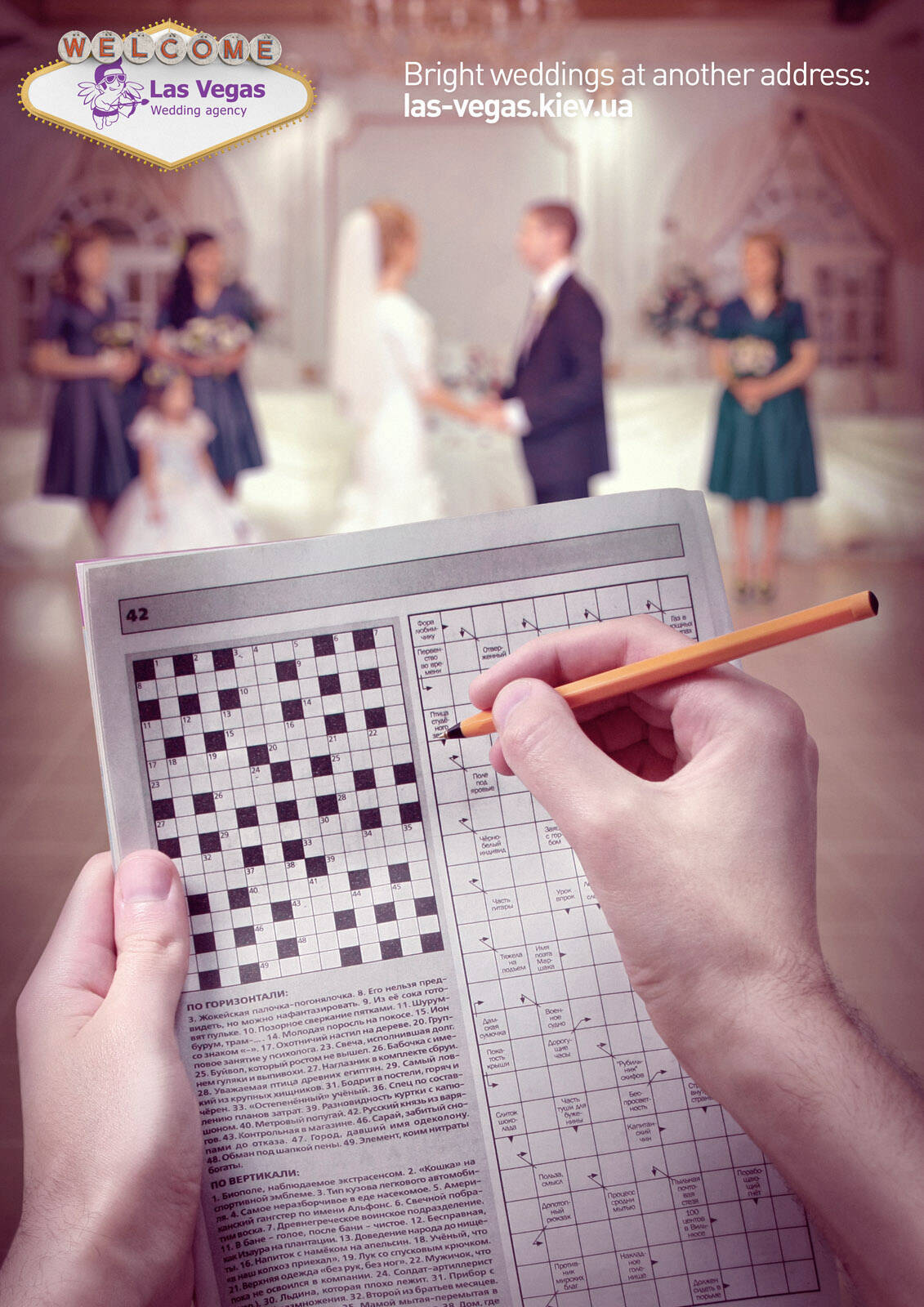 This professional campaign titled 'Knitting, Solitaire, Crossword' was published in Ukraine in May, 2012. It was created for the brand: Las Vegas Wedding Agency, by ad agency: Michurin. This Print medium campaign is related to the Professional Services industry and contains 3 media assets. It was submitted over 13 years ago.