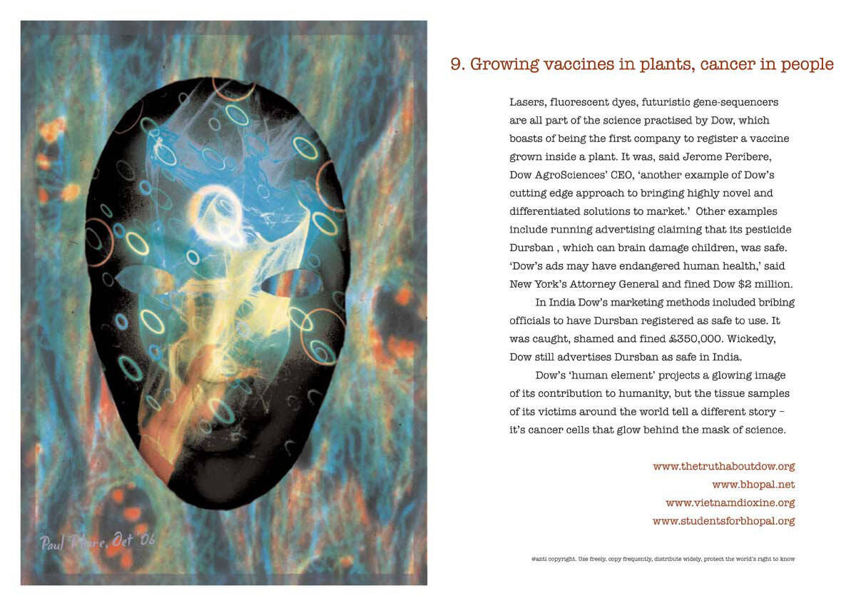 Paul Phare's series of artworks, "A glimpse behind the mask of Dow" is a personal response to Dow Chemical's "human element" advertising campaign, on which Dow has spent $30 million. As those harmed by Dow's poisons are some of the poorest, most helpless people on the planet, they can't match this spend, but they have something more valuable than dollars. They have you. Please download these posters and spread them widely.