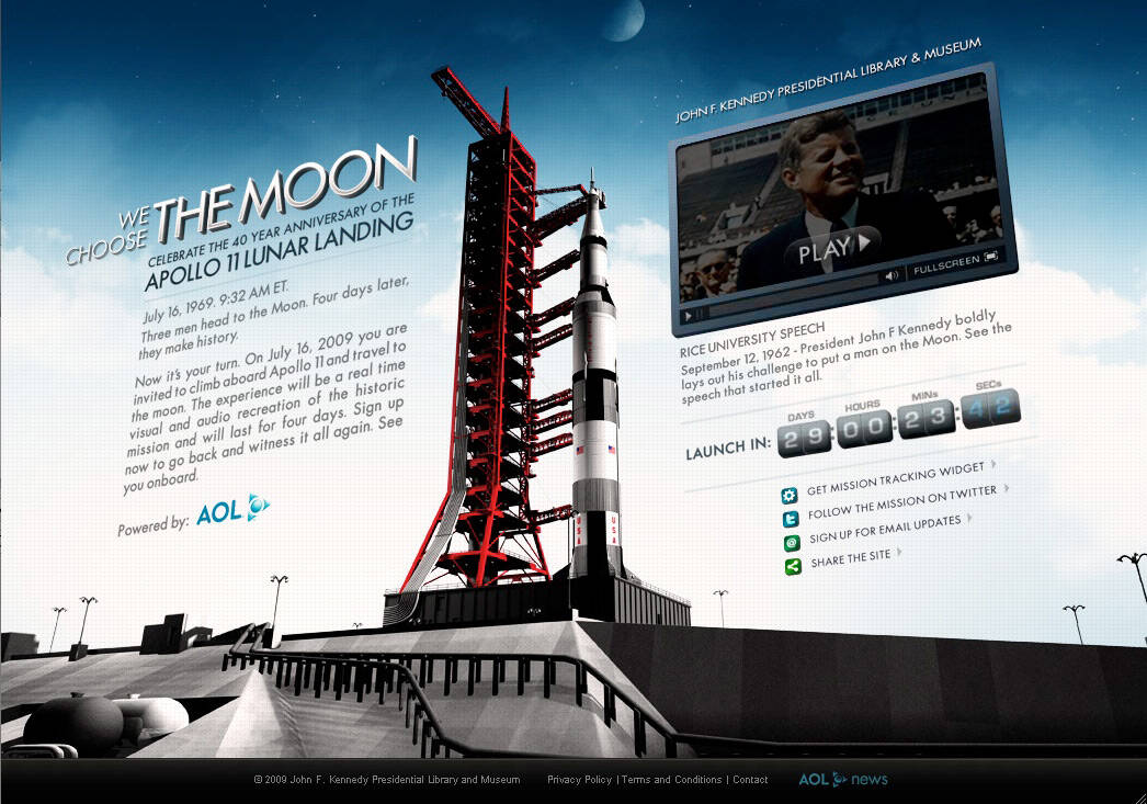 The teaser site announcing a virtual recreation of the trip to the moon in 1969, envisioned by John F. Kennedy. The website will launch in real time at 9:32 AM July 16 and millions will be able to take the trip in real time for the next 4 days. Follow on Twitter, explore rare documents, experience the trip just as the astronauts did 40 years ago.