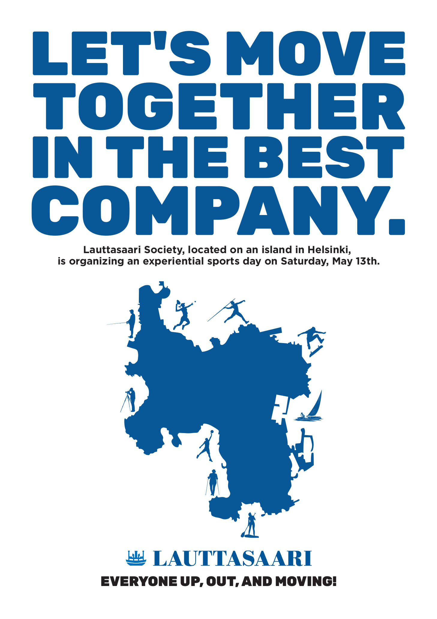 Lauttasaari (ferry island) is a suburban in Helsinki. Lauttasaari Society is an organization that takes care of the identity of the neighborhood. The Lauttasaari Society organized a sports day to activate people to get to know the island's diverse sports opportunities. There are four seasons in Finland, which offer a variety of exercise opportunities. The Sports Day event is organized in different seasons. The idea was to create an identity, content and ad for the event that communicates the island's versatile sports opportunities and is easily adaptable to events organized in different seasons.