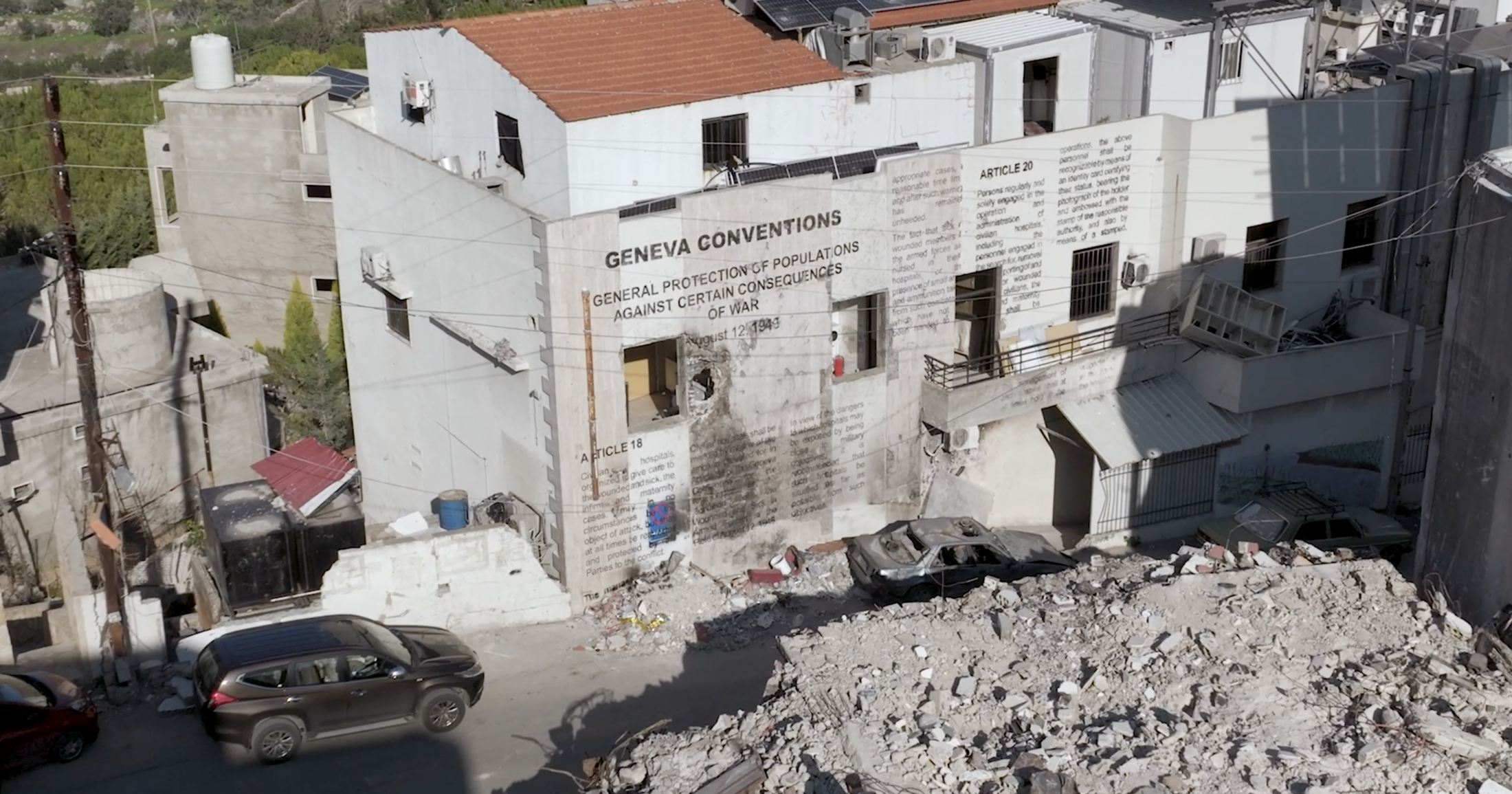 Amid the rubble and scars of the Hospital, Lebanese muralist and calligrapher Ghaleb Hawila meticulously inscribed articles from the Geneva Convention onto the building’s shattered walls. Each crack and burn stands as concrete evidence of international law violations—an arresting reminder that these laws must be honored and not ignored.