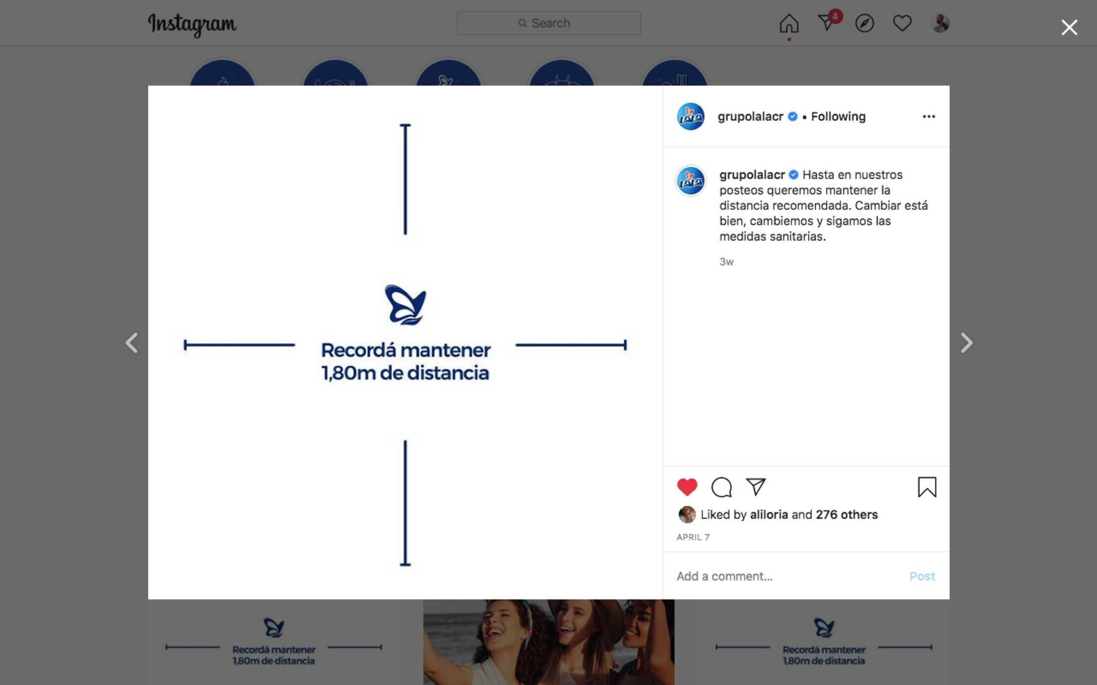 Our regional client asked for a digital strategy for adapting to the COVID-19 pandemic. We did it through a trimestral strategy, that includes this idea. Our study reports that 62% of consumers consider that brands should take a stand on this new pandemic and help them get through it. So we decided to remind our Instagram fans the most important measure of all to fight this disease: social distancing. That is why we changed our Instagram feeds, and began to leave blank spaces between each post, so we create awareness and rise consciousness. Because we thought that, if Instagram posts could distance themselves, imagine what you can do.