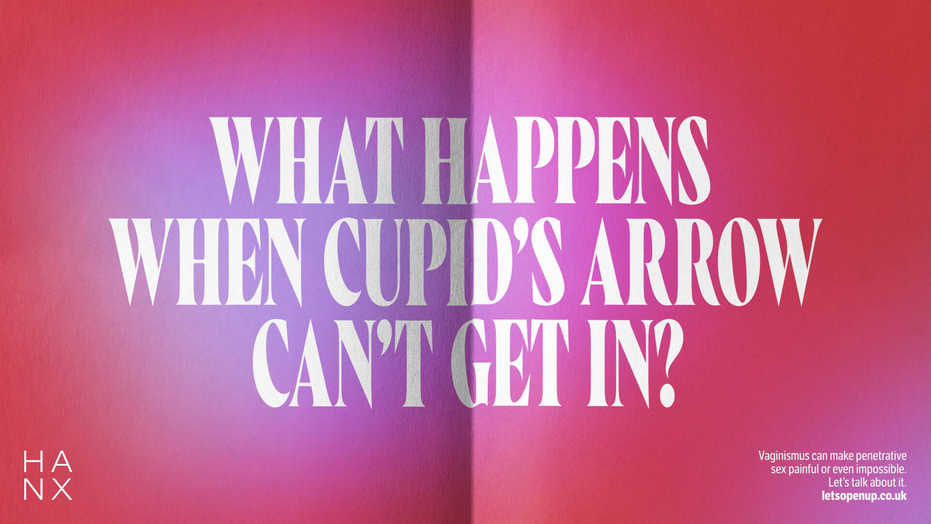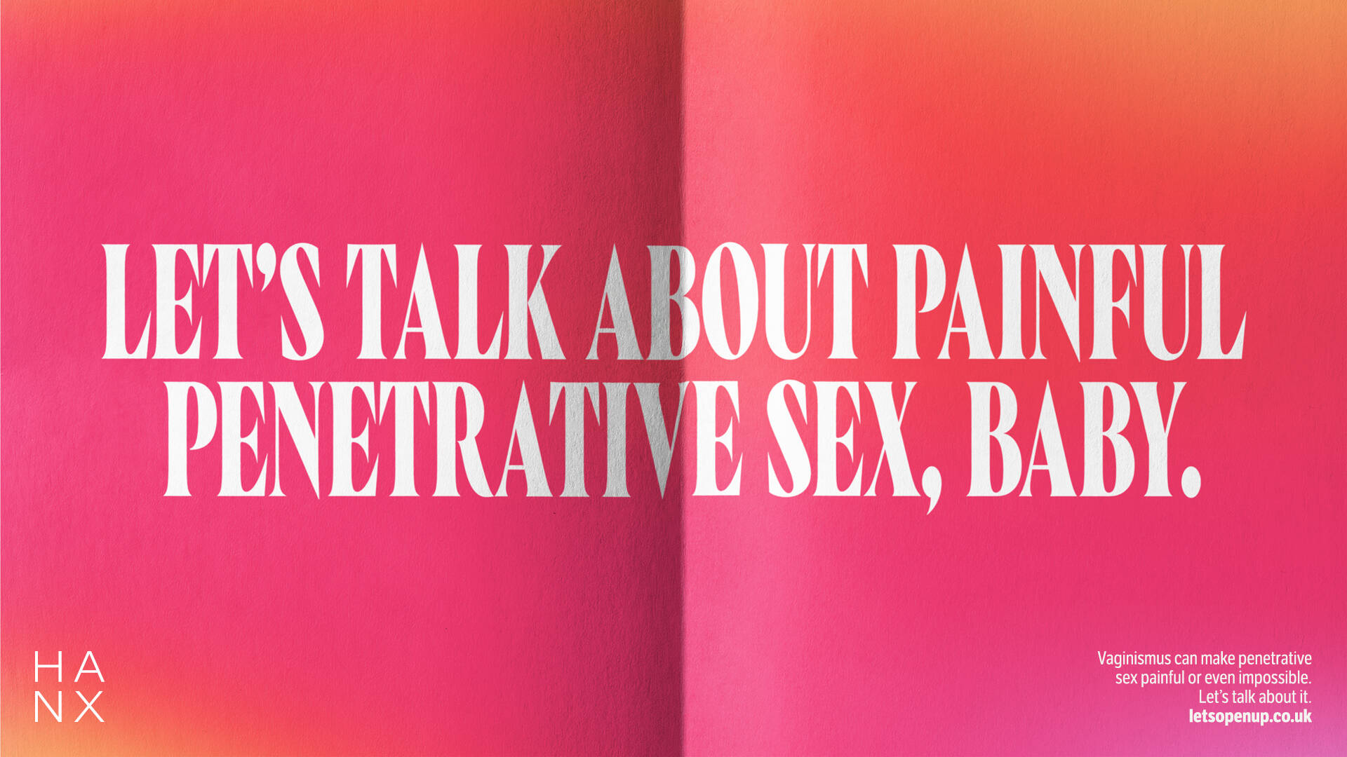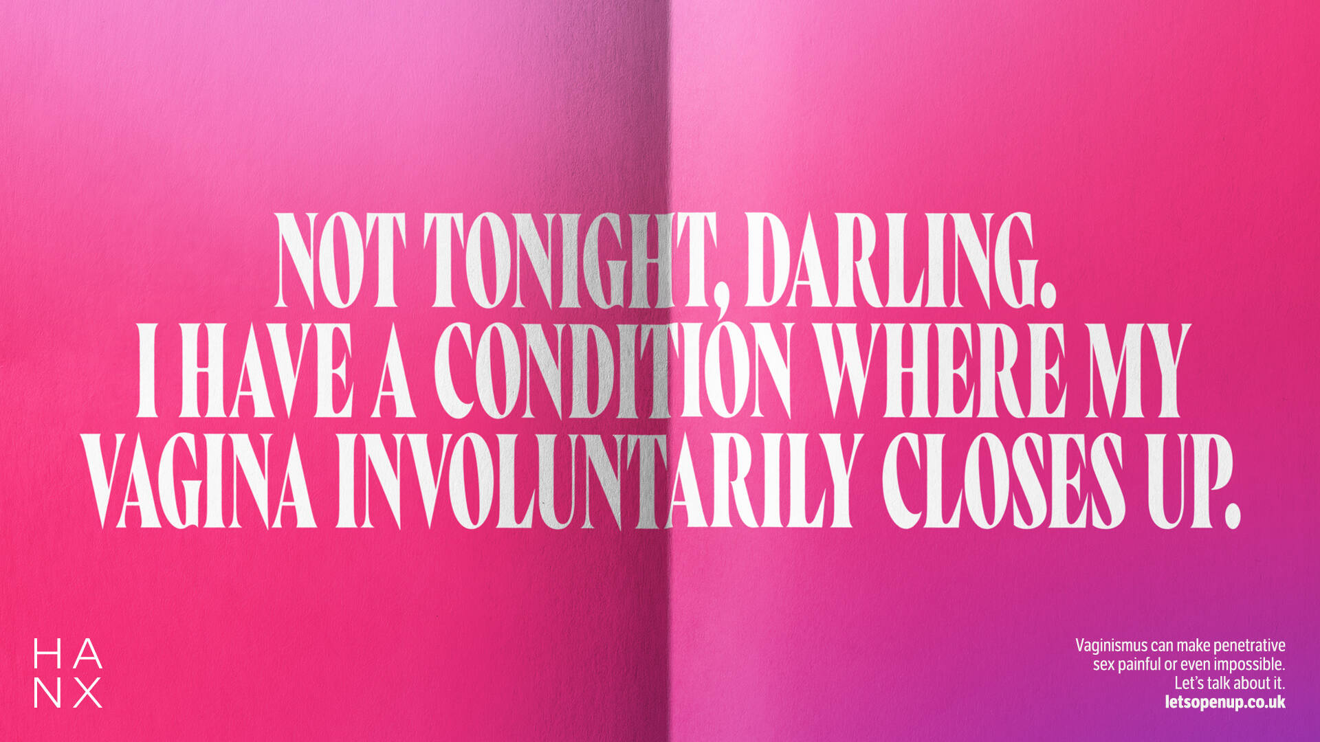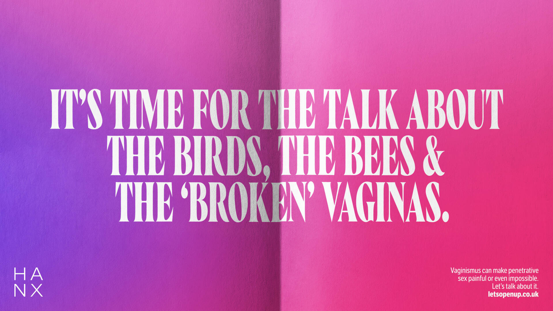 To help break the cycle and undo the taboo around vaginismus, HANX have launched a campaign encouraging people to open up and speak freely about the condition. Through a straight-talking and unapologetic OOH campaign, they aim to make readers as uncomfortable reading about vaginismus as those living with it feel.