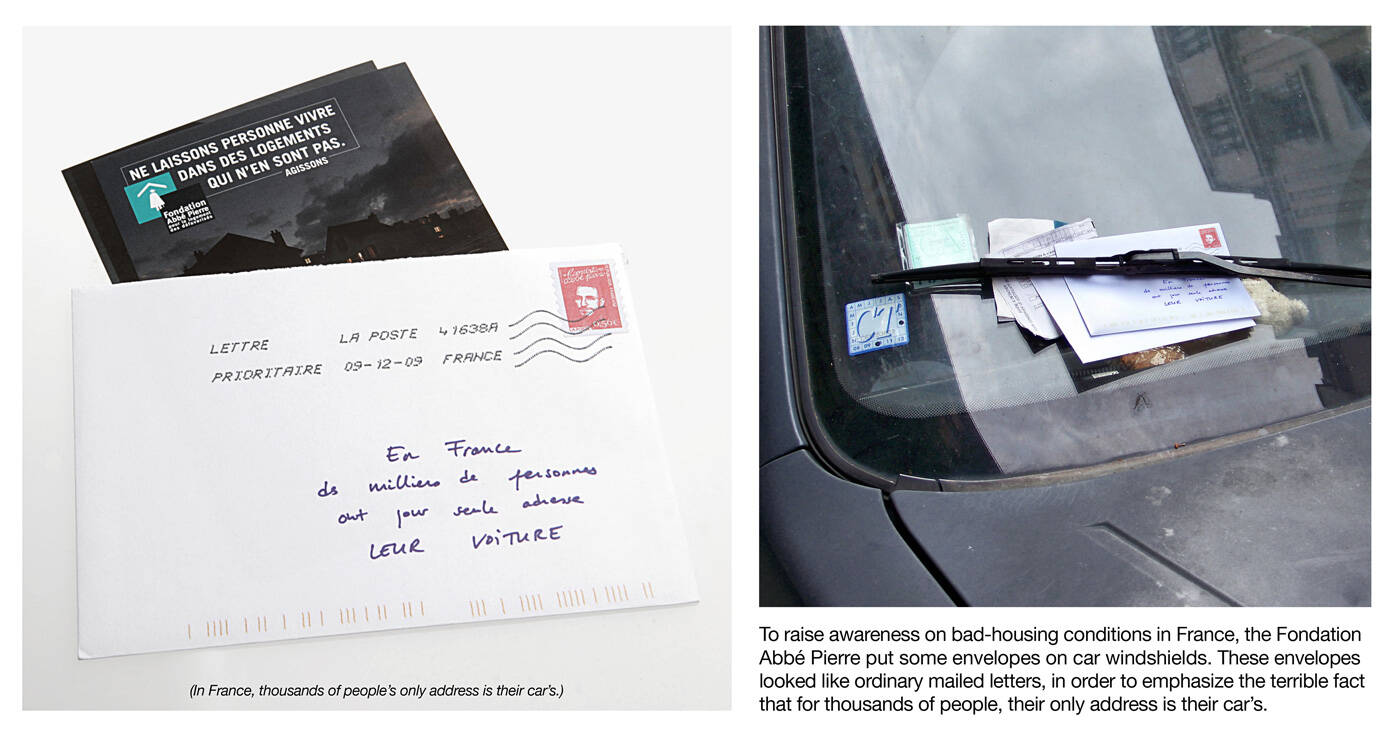 This professional campaign titled 'Letters on wind-shield guerilla' was published in France in May, 2010. It was created for the brand: Fondation Abbé Pierre, by ad agency: BDDP. This Ambient medium campaign is related to the Public Interest industry and contains 1 media asset. It was submitted over 15 years ago.