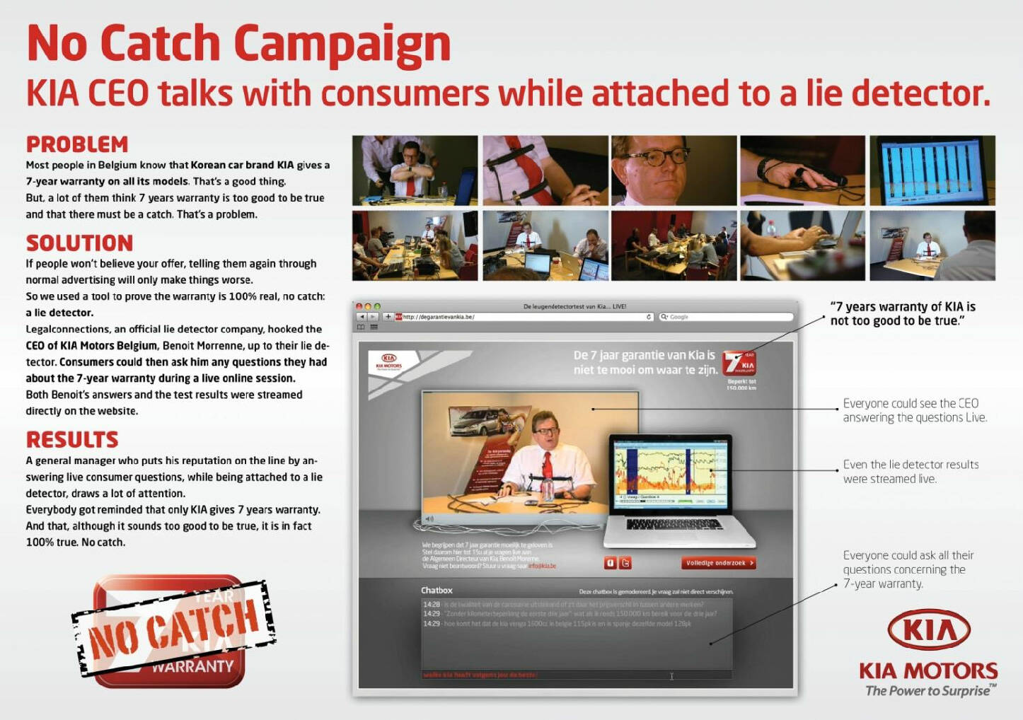 Creative Execution: Everybody got reminded that only KIA gives 7 years warranty. And that, although it sounds too good to be true, it is in fact 100% true and that there is no catch. Describe the creative solution to the brief/objective. We used the one thing that could prove the warranty is genuine and that there is no catch: a lie detector. Legal connections, an official lie detector company, hooked the CEO of KIA Motors, up to their lie detector. Consumers could then ask him any questions they had about the 7-year warranty during a live online session. Both Benoit’s answers and the test results were streamed directly to the website. This very special stunt was communicated through newspaper ads, banners and a press release telling everyone that an actual CEO would be undergoing a live lie detector test.