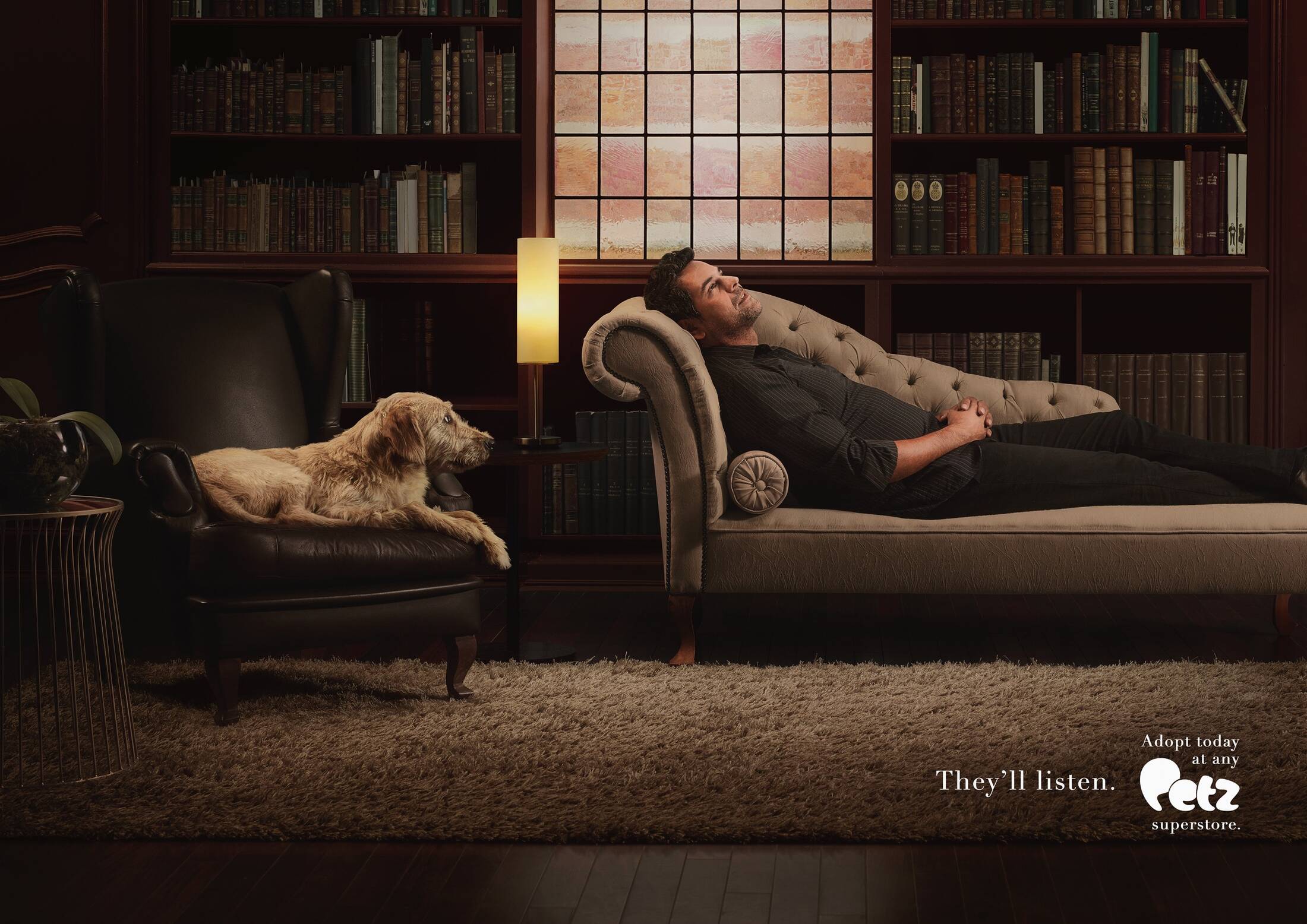 Pet shop network Petz launches a campaign in homage to the companionship and love only a pet can offer. “Listeners” reminds us how animals can be good companions for all times. To illustrate that thought, the ads feature images of pet owners lying on couches in their own homes. In the armchair beside are their pets. The position they take suggests an ongoing psychoanalytic session. The concept associated with the pieces is “They do listen to you. Adopt a pet.”