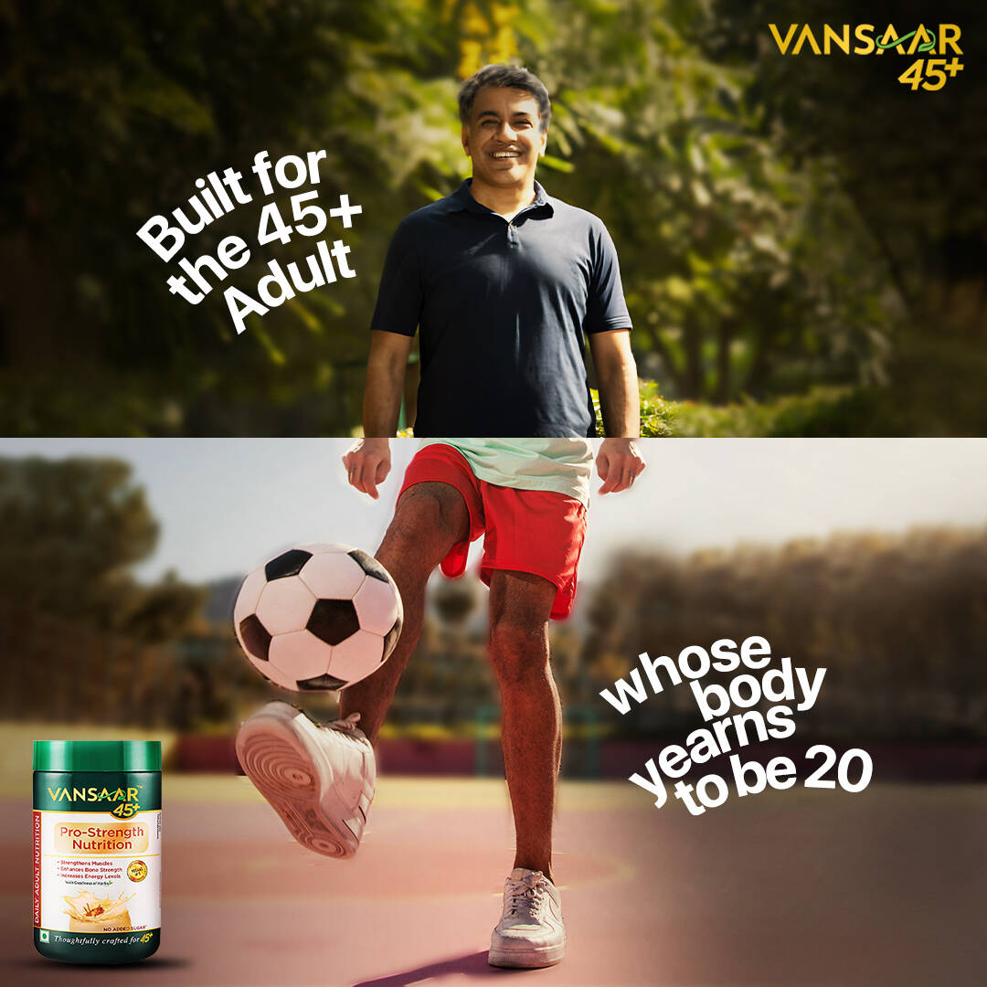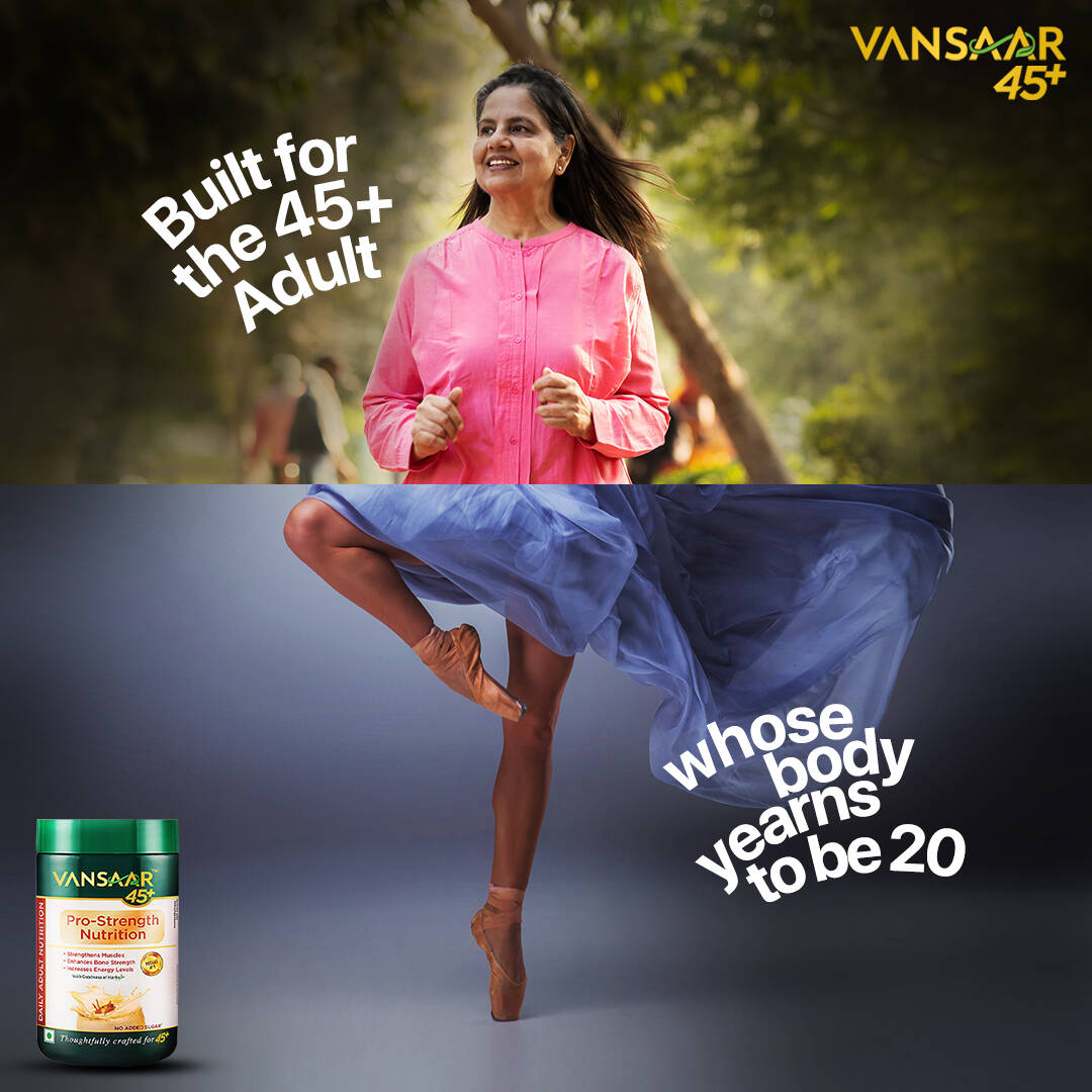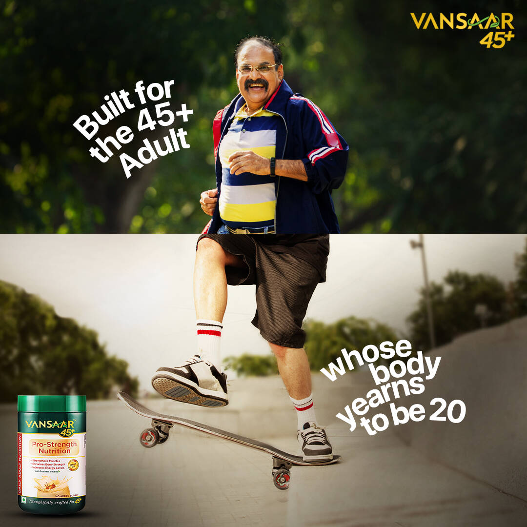 Vansaar 45+ Pro-Strength Nutrition is a nutrition drink specially crafted for the 45+ Indian body, recognizing the core insight: At 45+, your body may not keep up with the lifestyle you had when you were younger, forcing you to make compromises and miss out on what you love. Vansaar 45+ Pro-Strength Nutrition is designed to help you reclaim the strength and vitality of your 20s, even in your 40s and beyond, enabling you to continue living life without compromise.