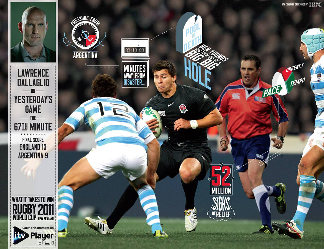 This professional campaign titled 'Live Press - Fra vs Nzl, Live Press - Eng vs Sco, Live Pr...' was published in United Kingdom in November, 2011. It was created for the brand: ITV, by ad agency: BBH. This Print medium campaign is related to the Media industry and contains 8 media assets. It was submitted about 14 years ago.