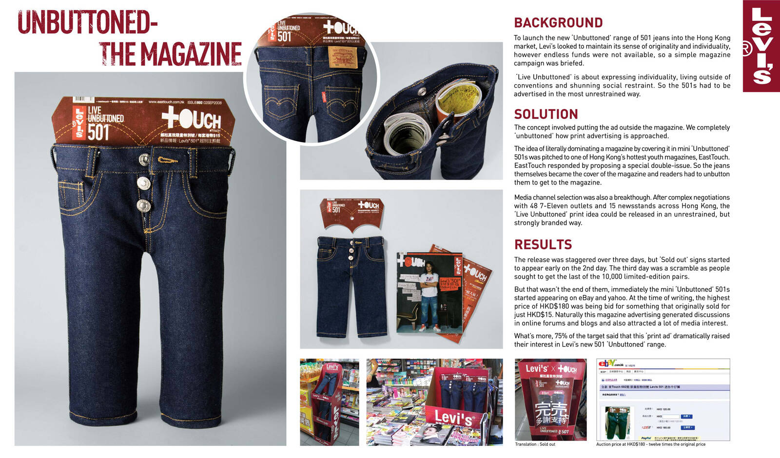 This professional campaign titled 'Live unbuttoned' was published in China in September, 2008. It was created for the brand: Levi's, by ad agency: TBWA. This Ambient medium campaign is related to the Fashion industry and contains 1 media asset. It was submitted about 17 years ago.