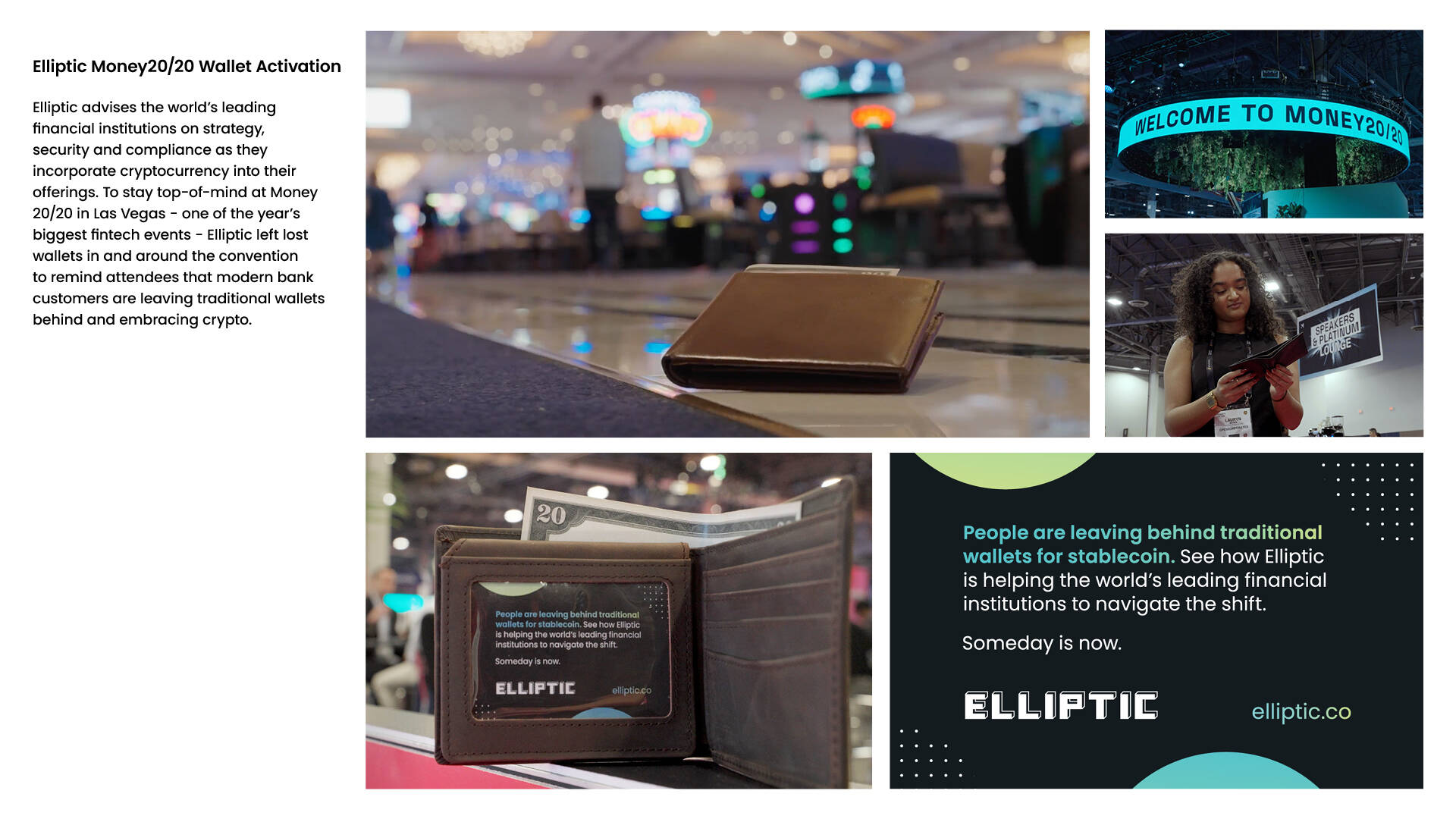 As digital currency gains mainstream legitimacy, Elliptic has emerged as a leading advisor to the world's biggest financial institutions on how best to adopt crypto into their offerings. This “Lost Wallets” effort debuted at one of the year’s largest fintech events - Money 20/20 in Las Vegas - and has been executed at subsequent conferences after its initial success, with videos of the activation shared on social channels with targeted, paid support.