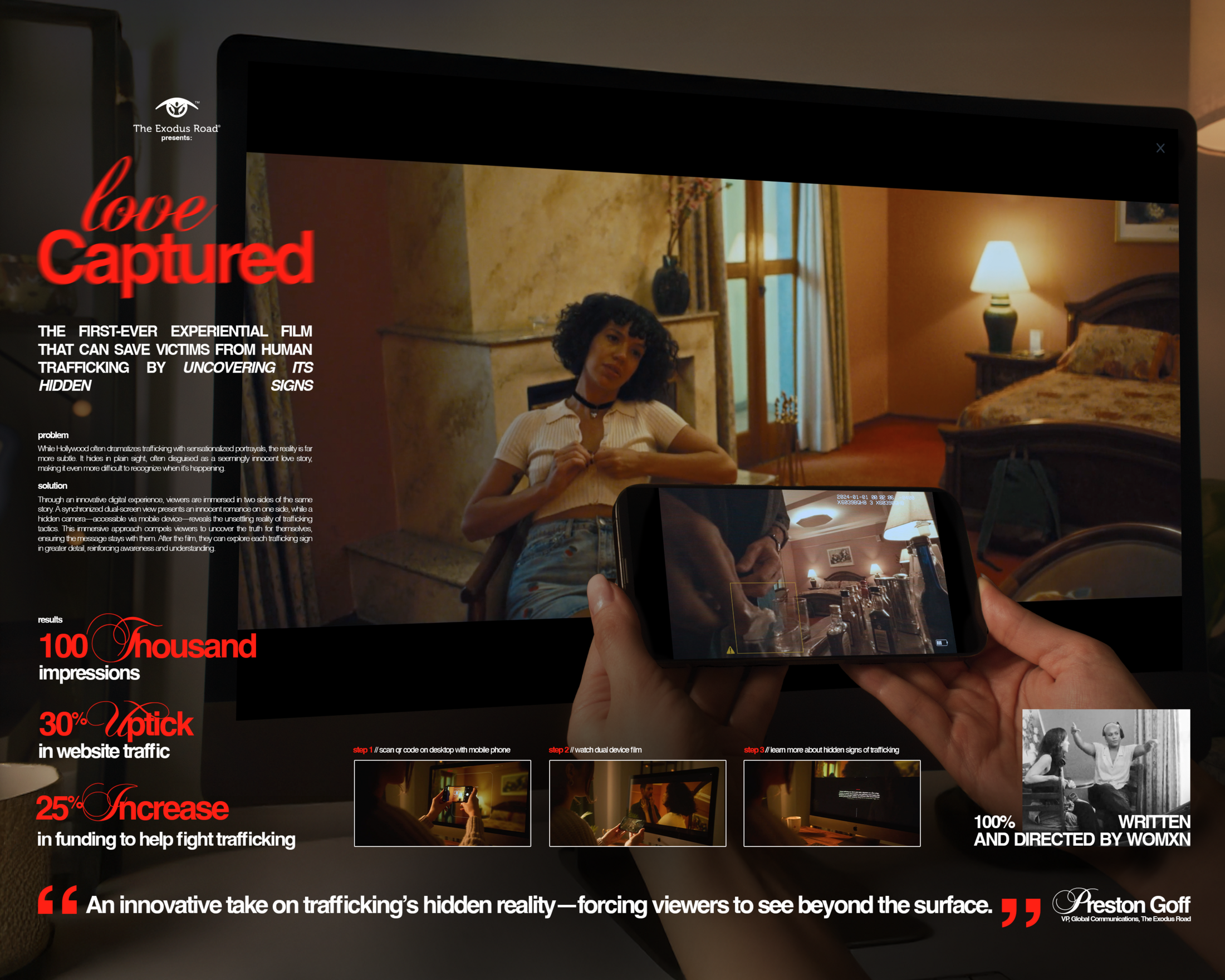 This professional campaign titled 'Love Captured' was published in Canada in December, 2025. It was created for the brand: The Exodus Road, by ad agency: Klick Health. This Integrated medium campaign is related to the Health industry and contains 4 media assets. It was submitted 6 days ago.