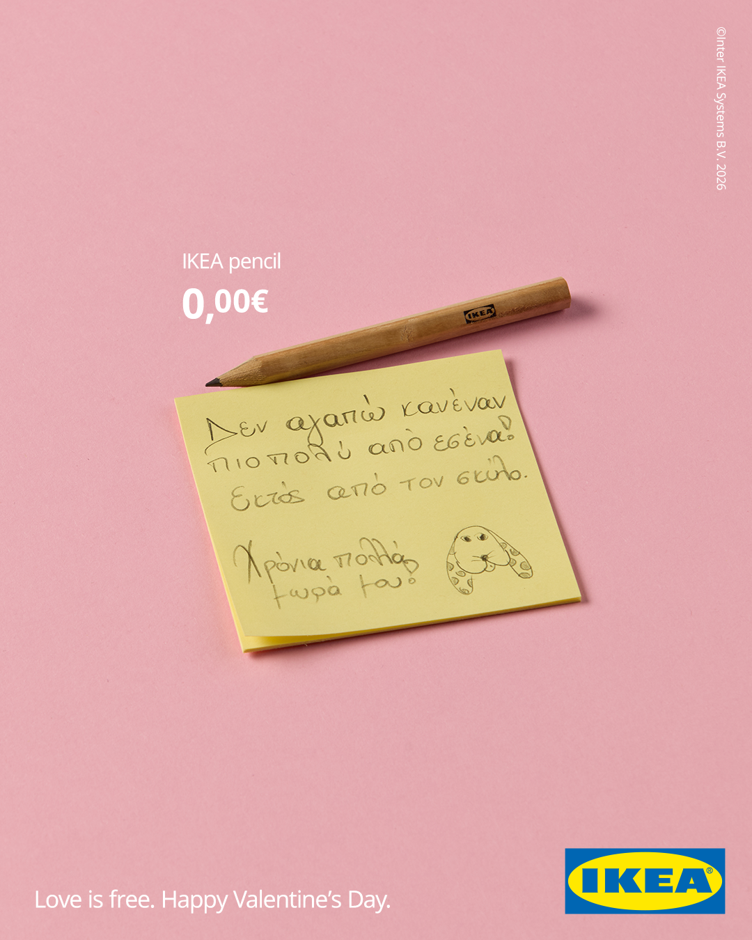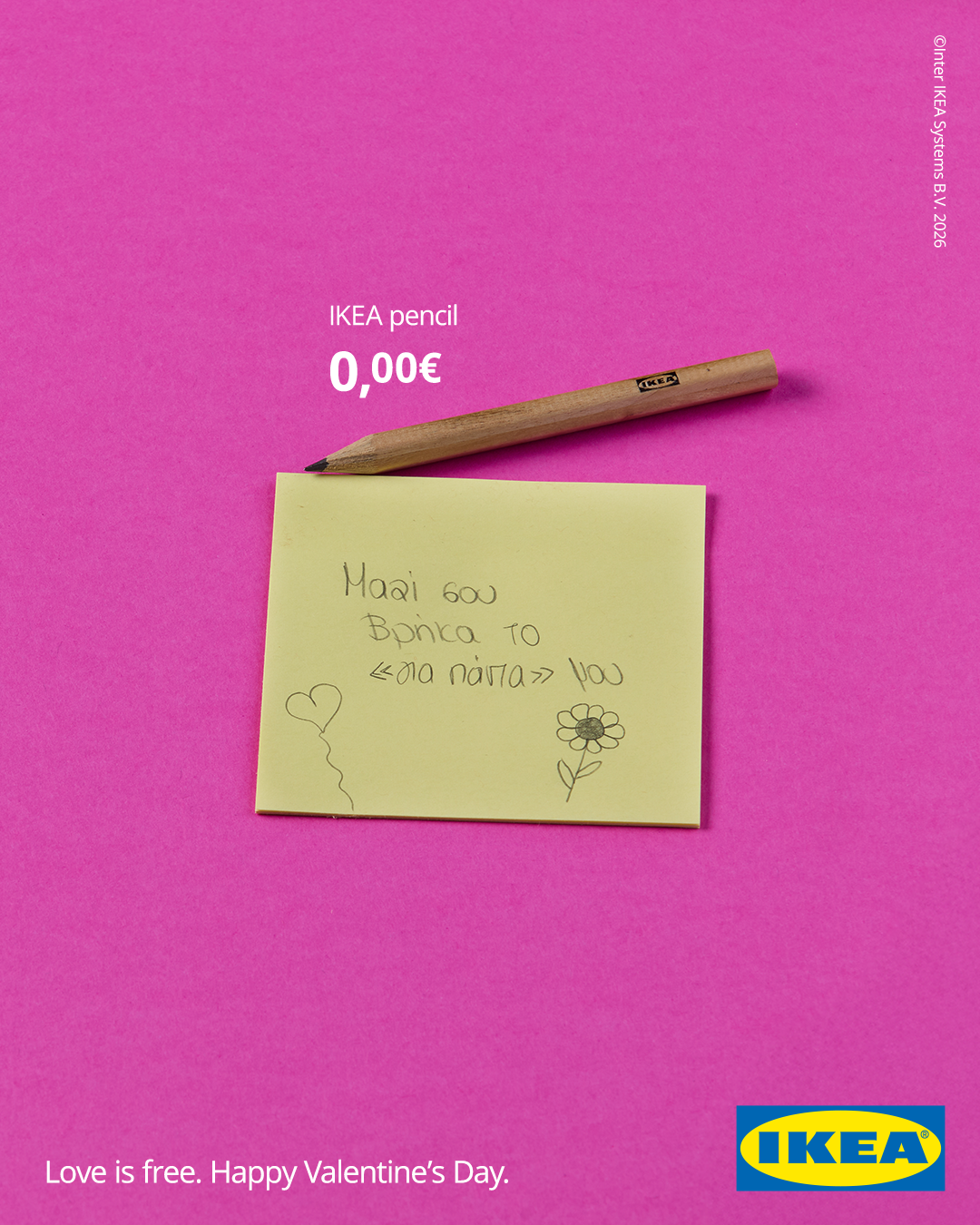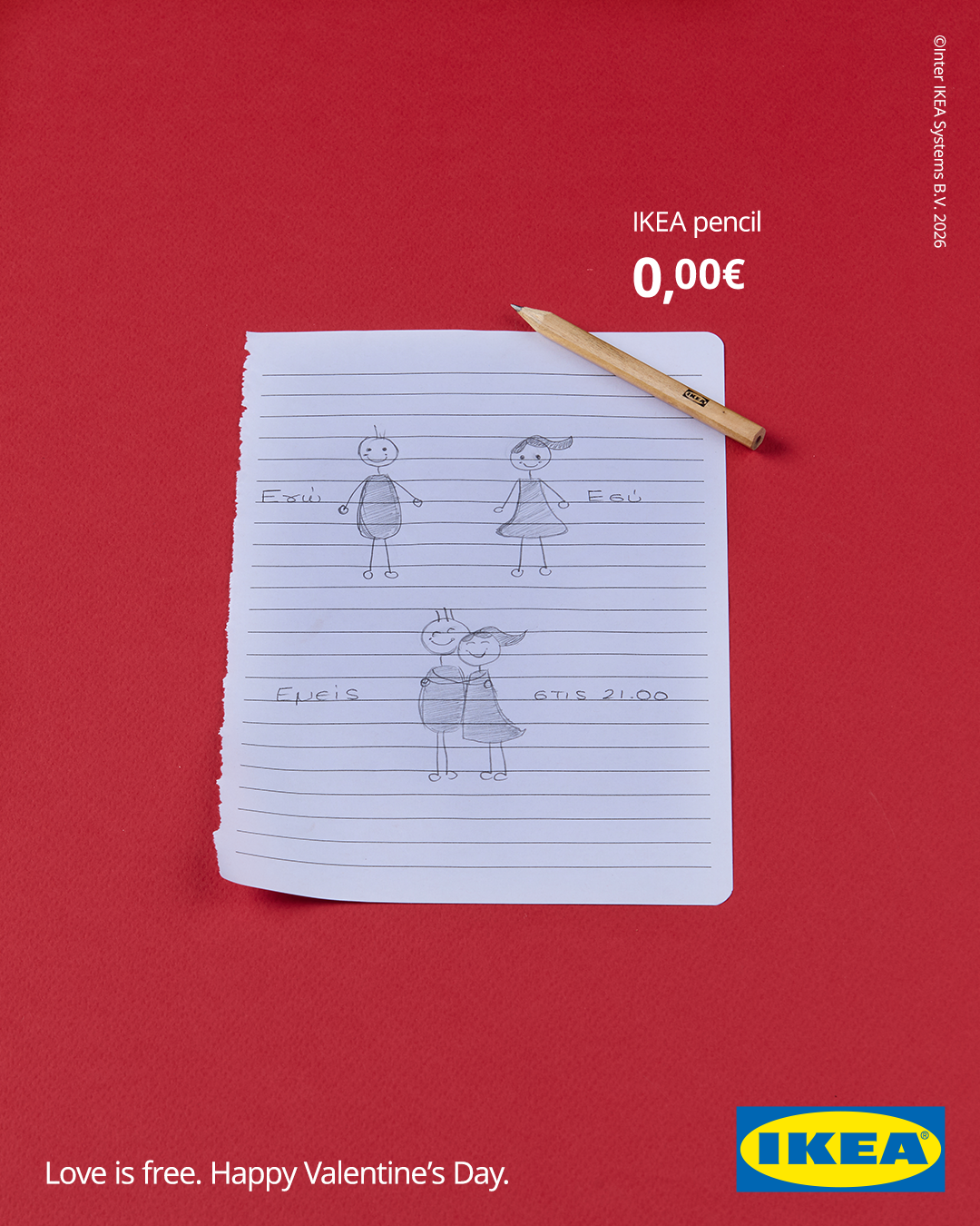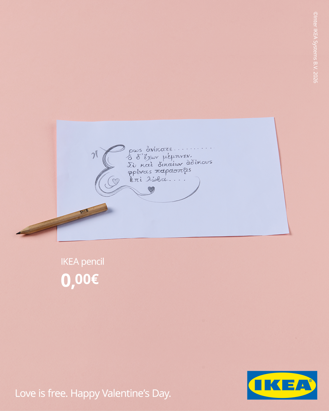 This professional campaign titled 'Love is Free' was published in Greece in February, 2026. It was created for the brand: IKEA Greece, by ad agency: The Newtons Laboratory. This OOH Outdoor and Print media campaign is related to the Retail Services industry and contains 8 media assets. It was submitted 24 minutes ago.