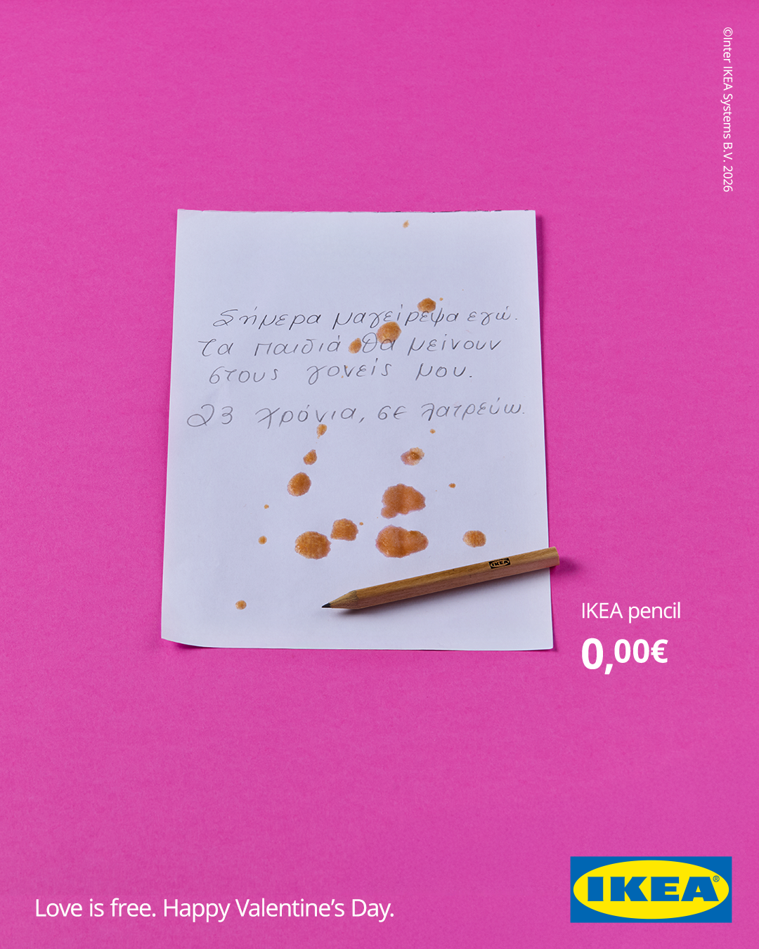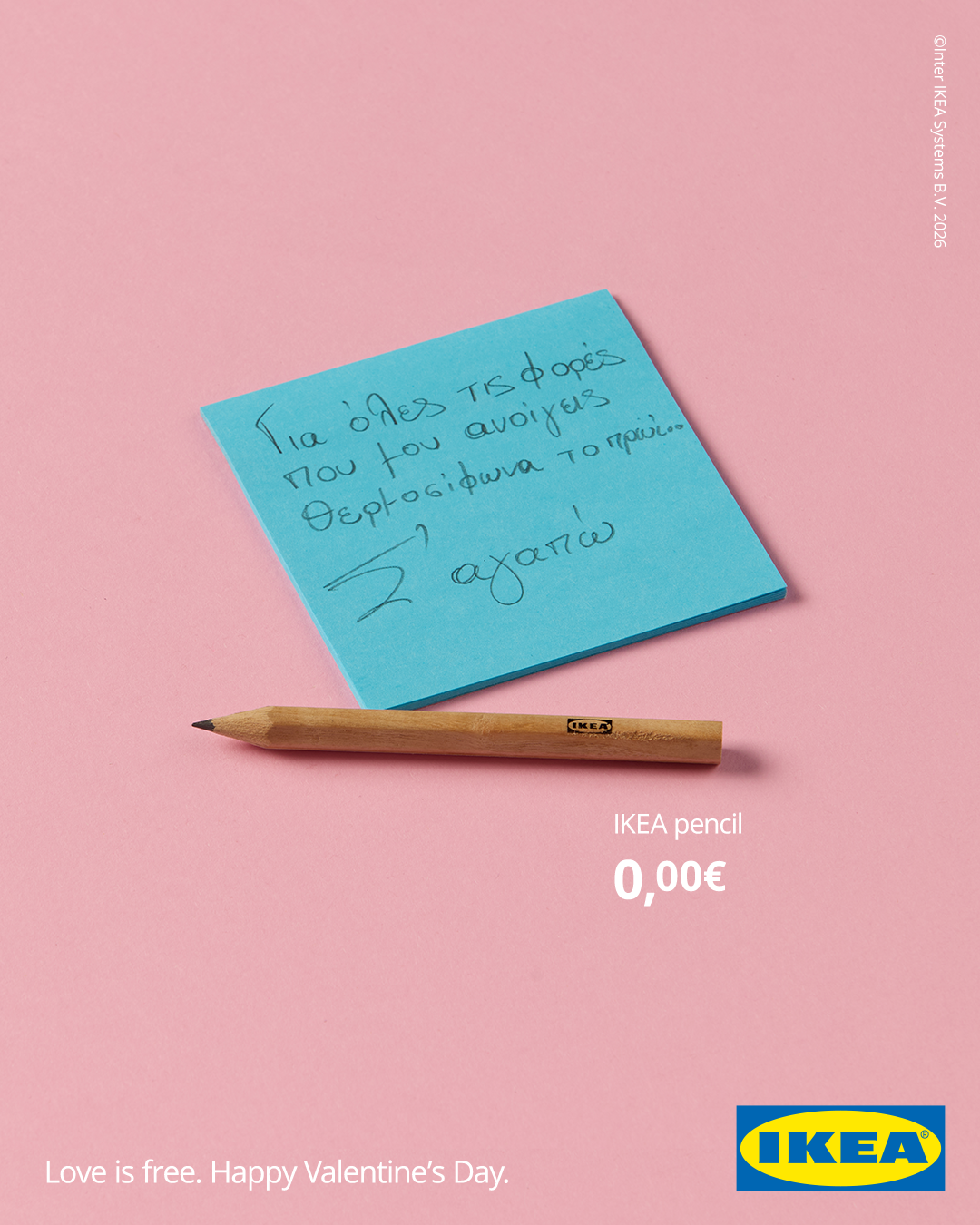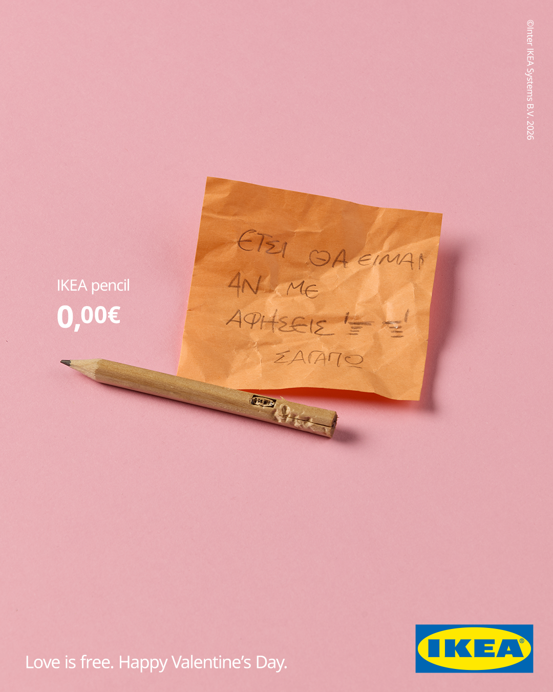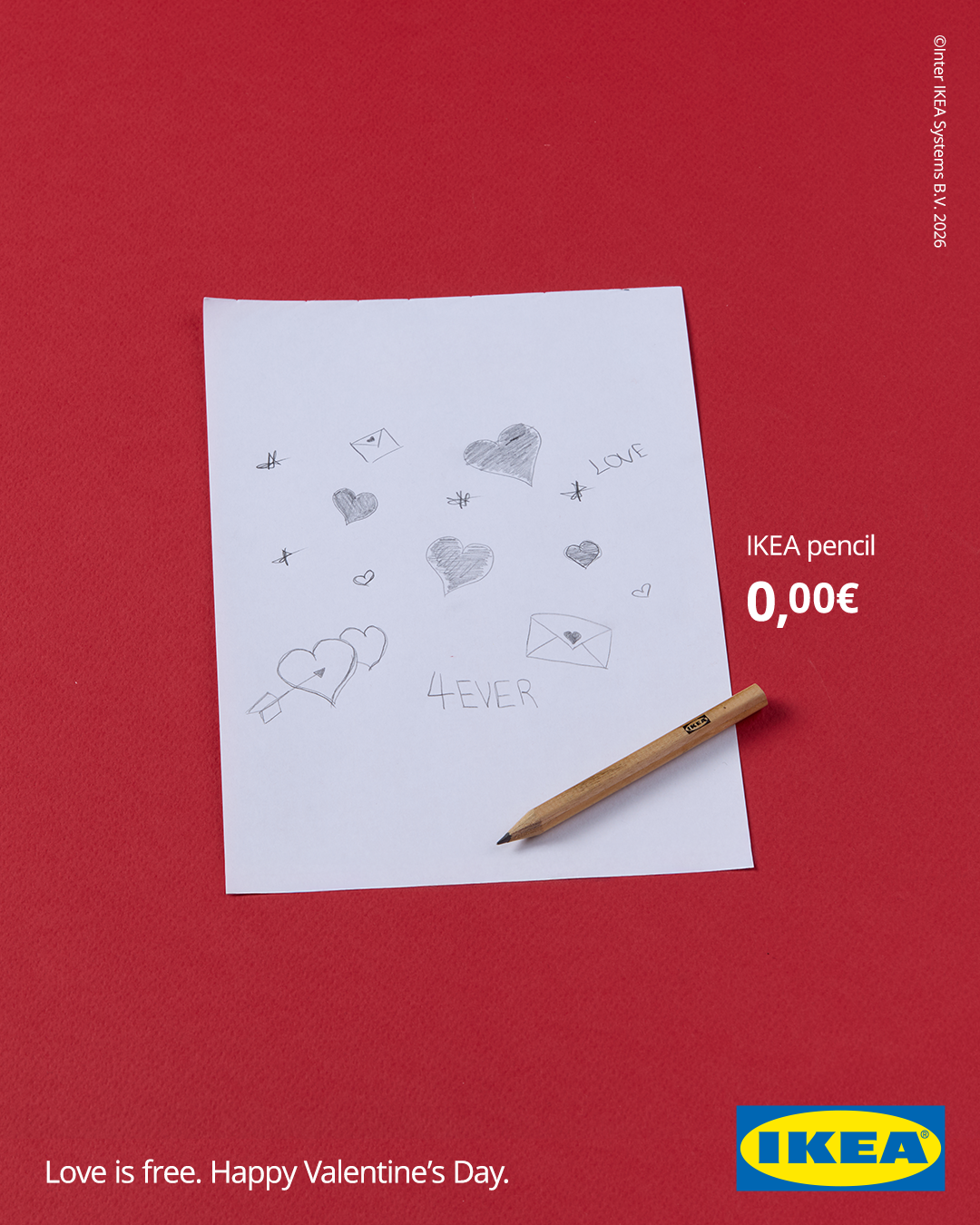 This professional campaign titled 'Love is Free' was published in Greece in February, 2026. It was created for the brand: IKEA Greece, by ad agency: The Newtons Laboratory. This OOH Outdoor and Print media campaign is related to the Retail Services industry and contains 8 media assets. It was submitted 24 minutes ago.
