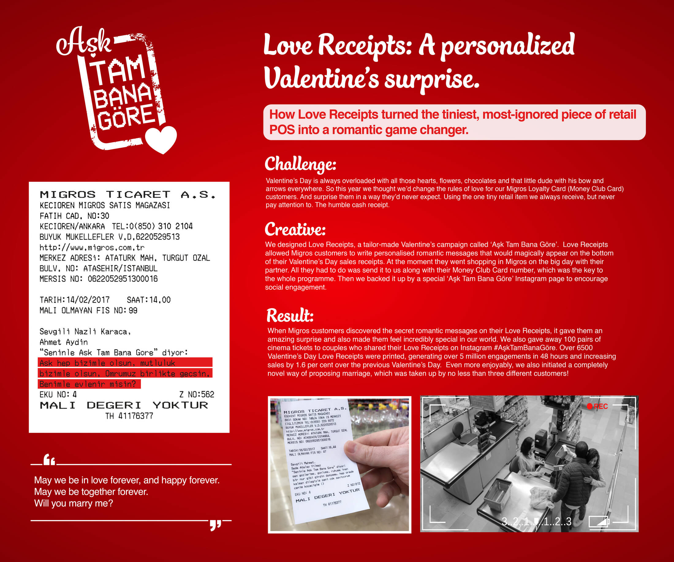 This professional campaign titled 'Love Receipts' was published in Turkey in February, 2017. It was created for the brand: Migros, by ad agency: Oliver. This Experiential medium campaign is related to the Food industry and contains 2 media assets. It was submitted over 8 years ago.