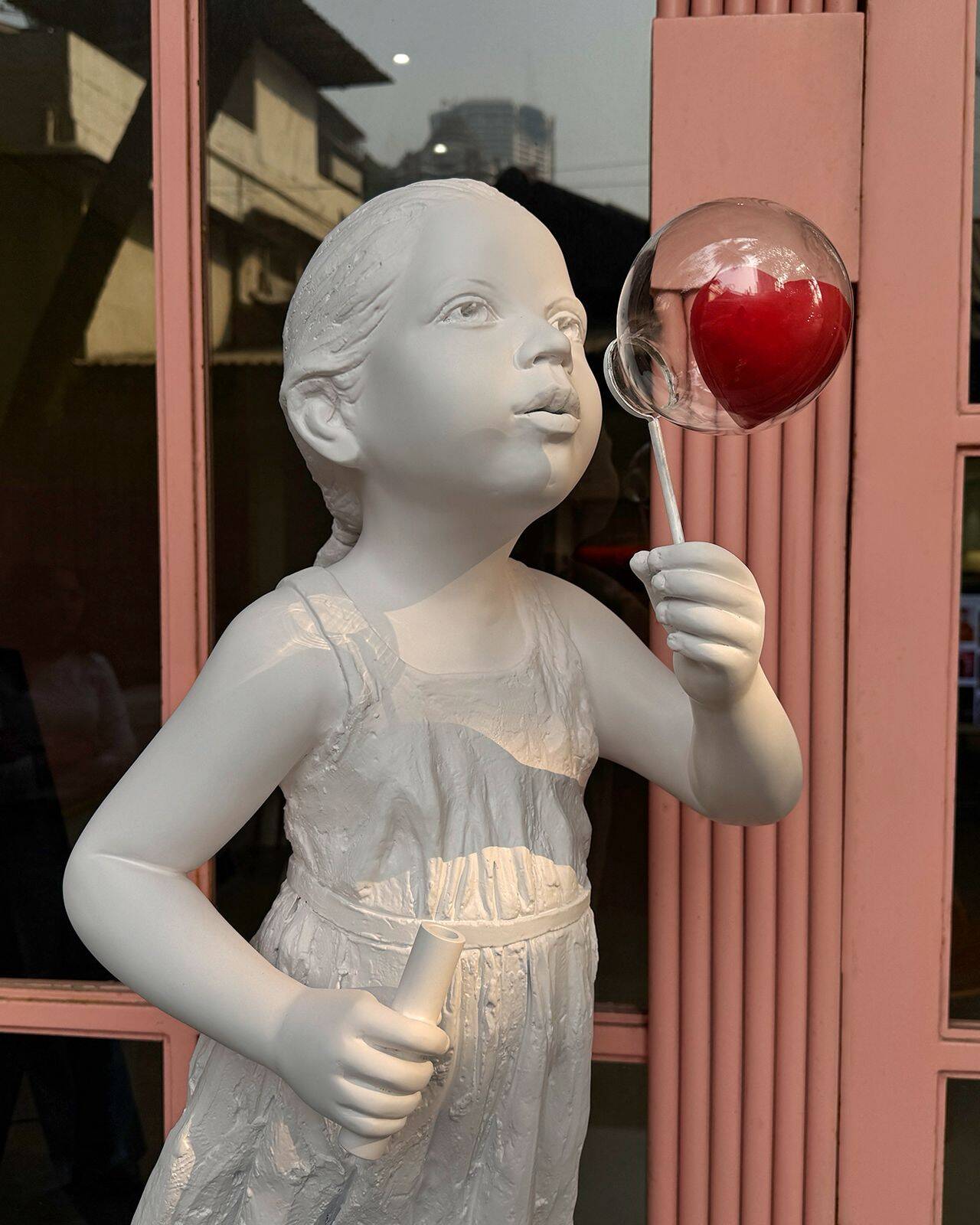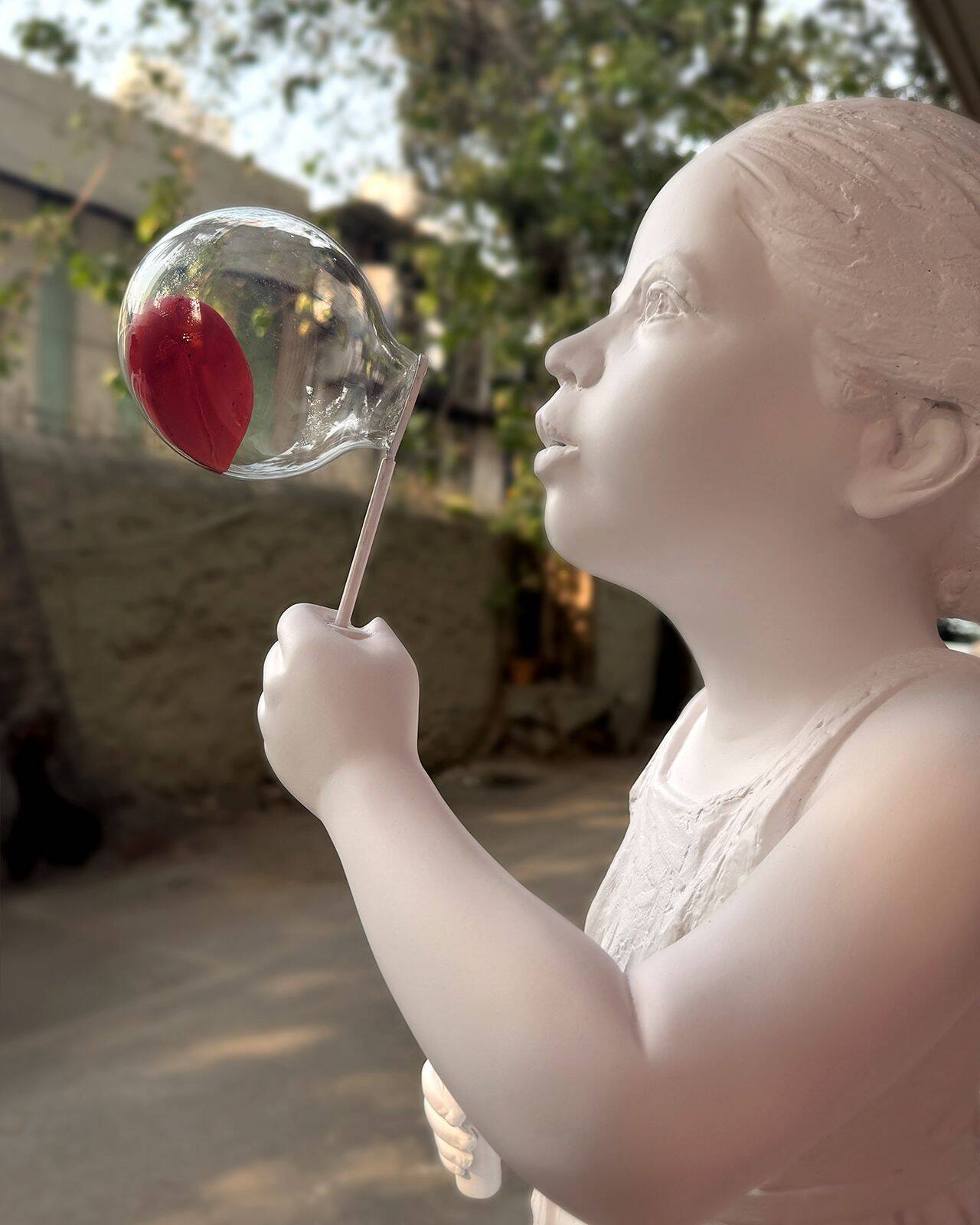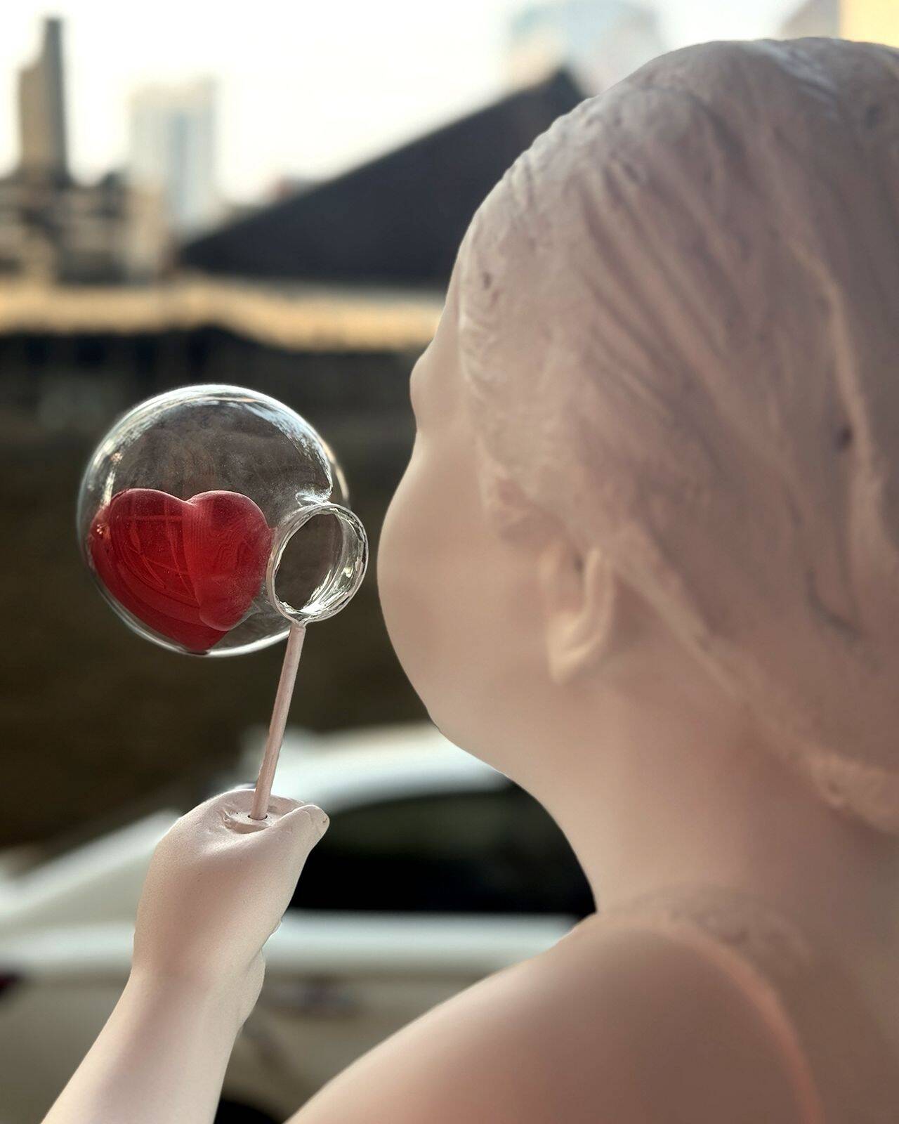 Then a translucent, heart-shaped bubble drifts slowly through the environment. Its movement is gentle and unforced, guided by subtle air currents or controlled kinetic rigging.