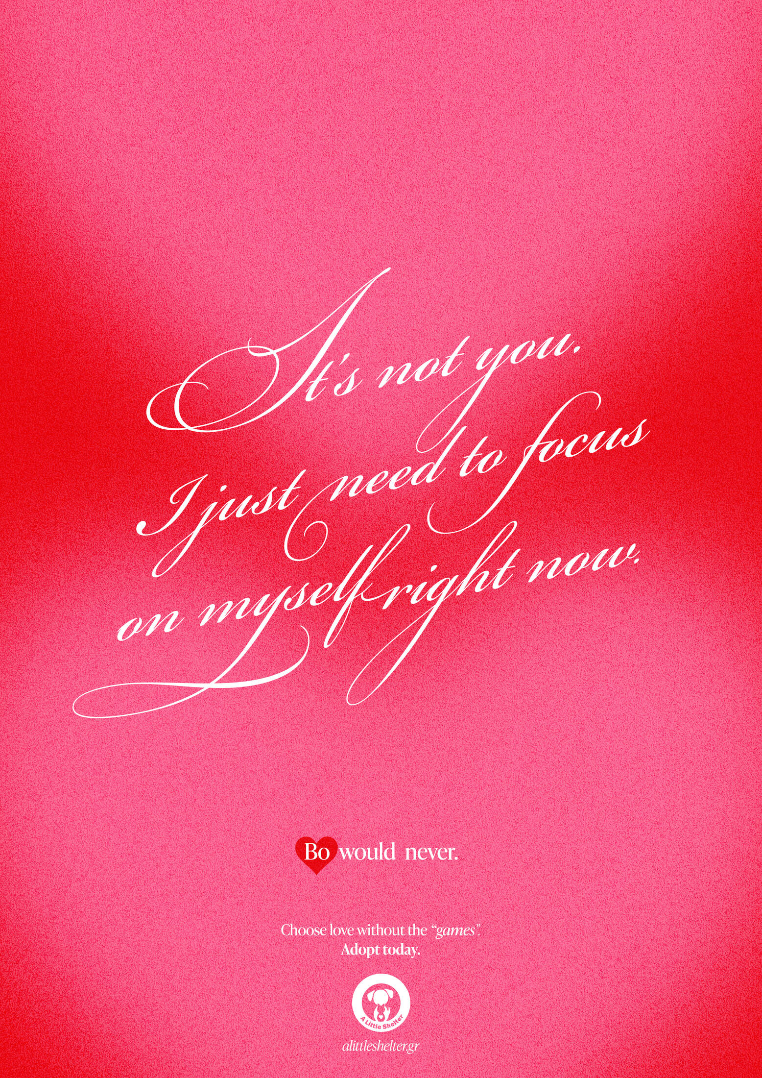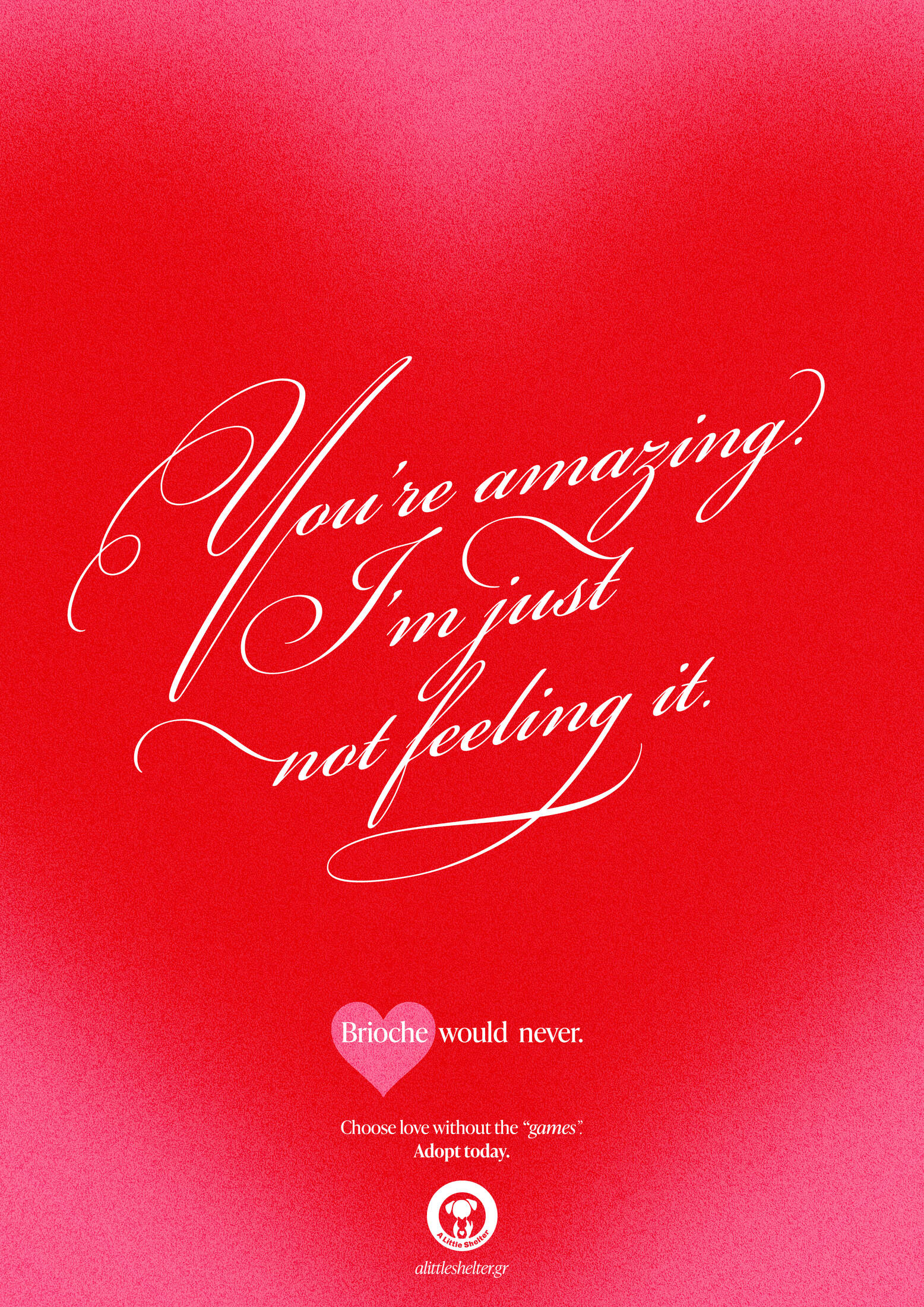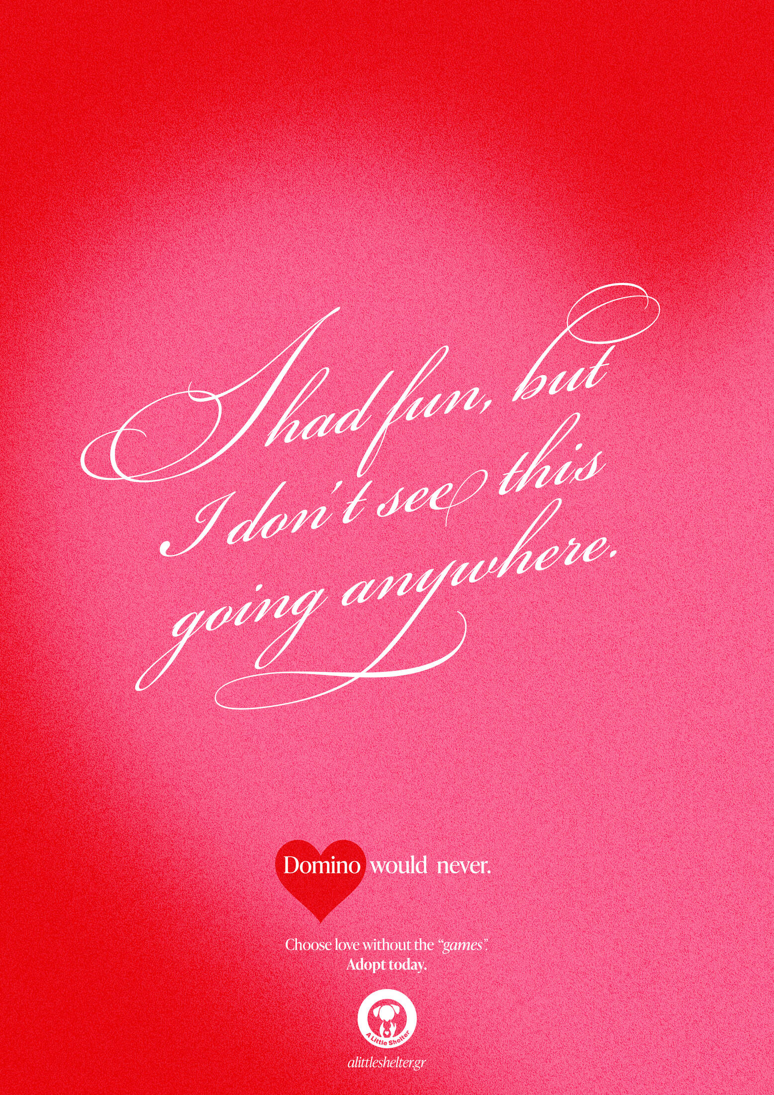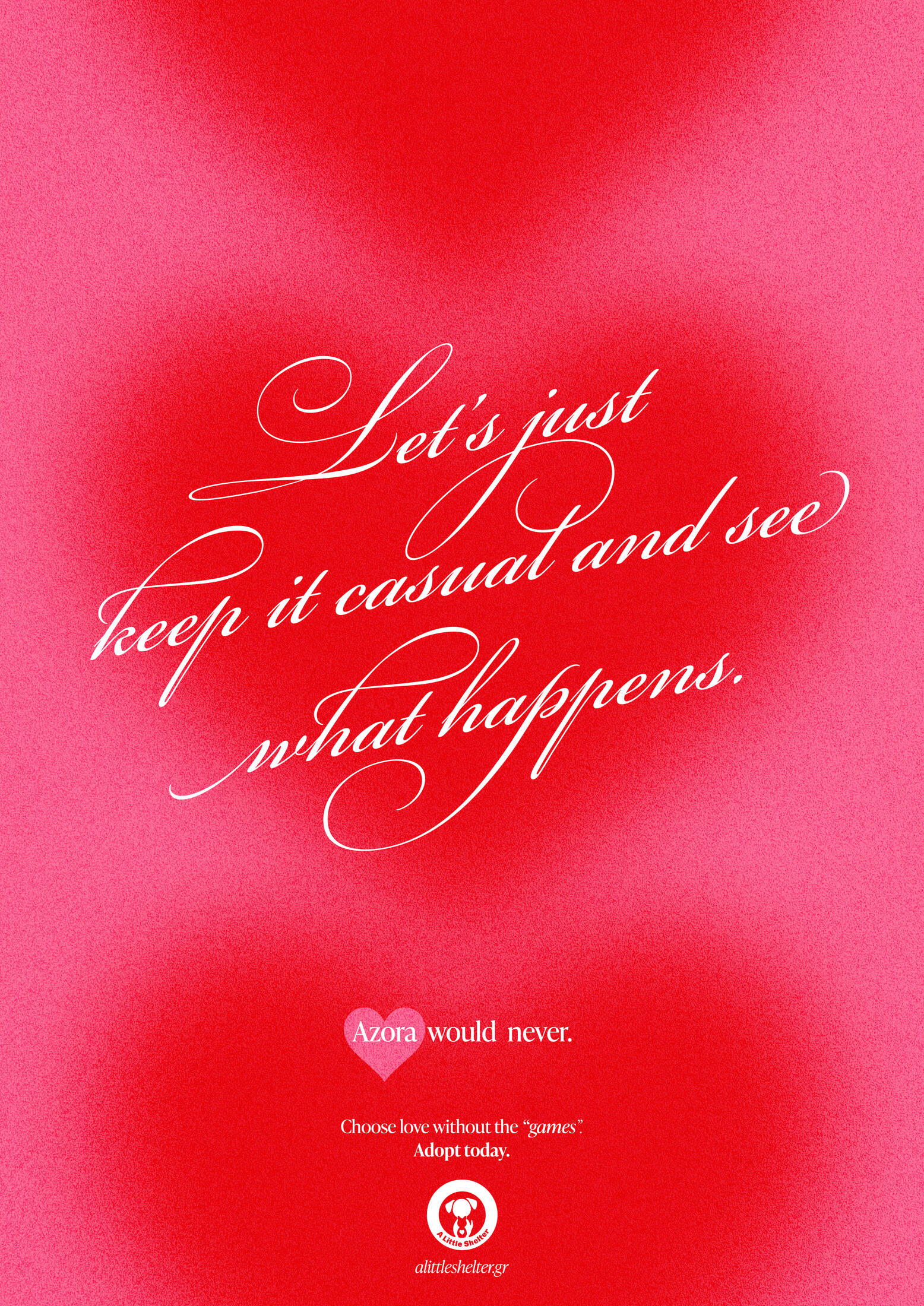 This professional campaign titled 'Love, without the games' was published in Greece in February, 2026. It was created for the brand: A Little Shelter, by ad agency: McCann Worldgroup Greece. This Print medium campaign is related to the Pets and Public Interest industries and contains 5 media assets. It was submitted about 1 hour ago by Art Director: Konstantinos Tsagkakos of McCann Athens.