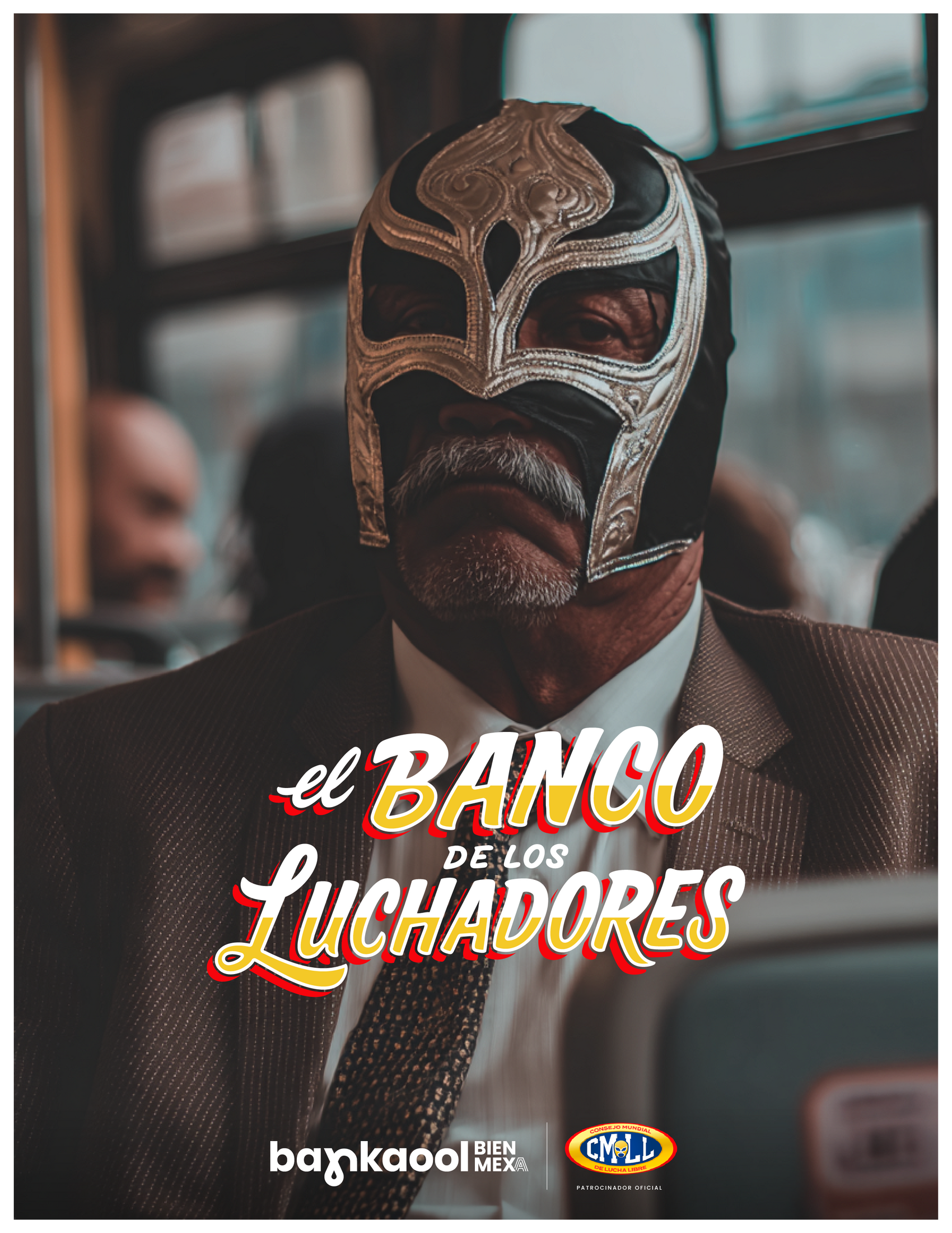 The “El Banco de los Luchadores” campaign turns the ordinary into the extraordinary by placing everyday heroes at the center: an elderly woman at her market stall, a cook behind the counter, and a man on his daily commute. All of them appear wearing lucha libre masks—an iconic symbol of Mexican culture—reimagined here as a metaphor for effort, resilience, and pride.