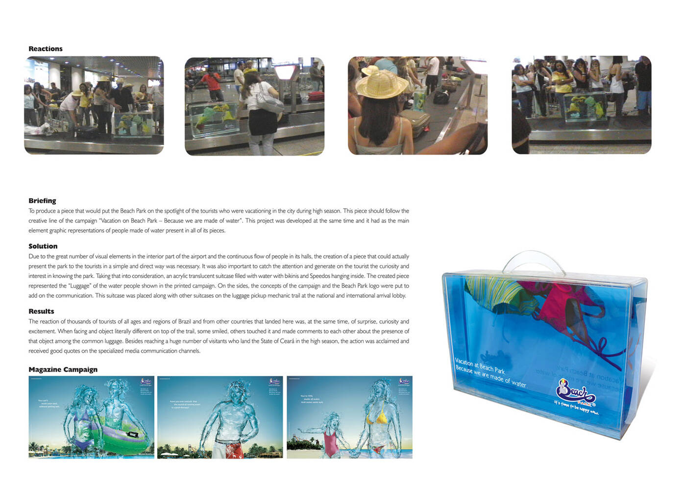 This professional campaign titled 'Luggage' was published in Brazil in October, 2008. It was created for the brand: Beach Park, by ad agency: Verve. This Ambient medium campaign is related to the Recreation, Leisure industry and contains 1 media asset. It was submitted about 17 years ago.