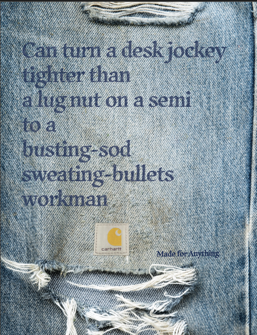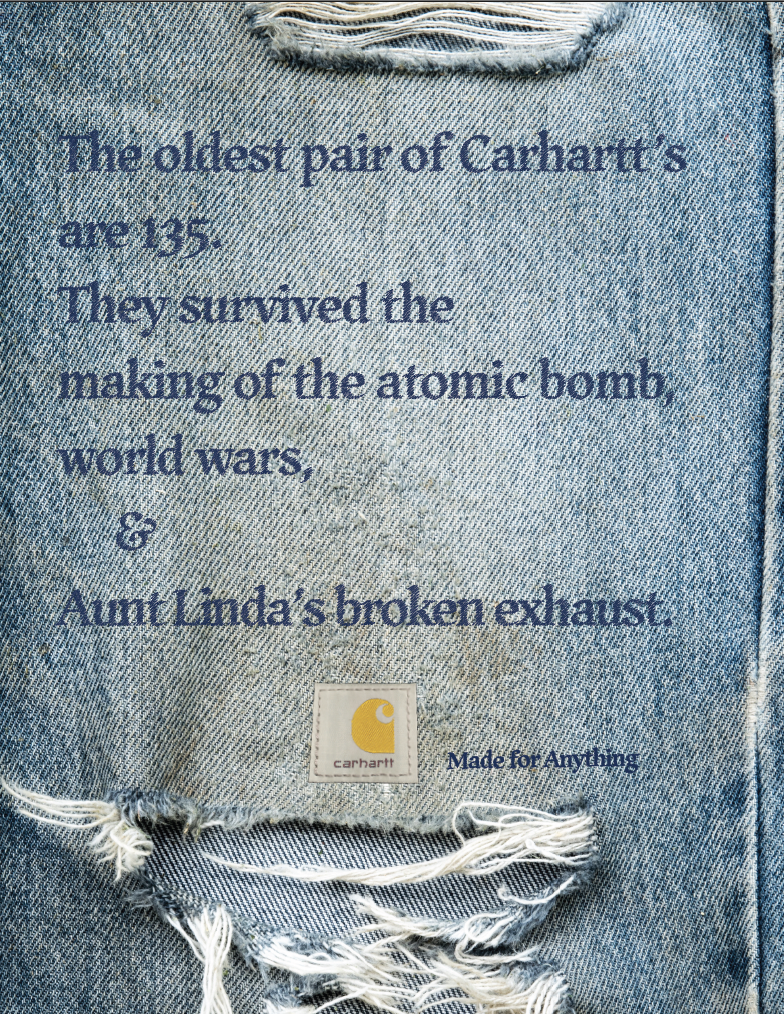 This student campaign titled 'Made for Anything' was published in United States in January, 2026. It was created for the brand: Carhartt, by ad schools: S.I. Newhouse School of Public Communications and Syracuse University. This Design, OOH Outdoor, and Print media campaign is related to the Industrial and Personal Accessories industries and contains 5 media assets. It was submitted 1 day ago.
