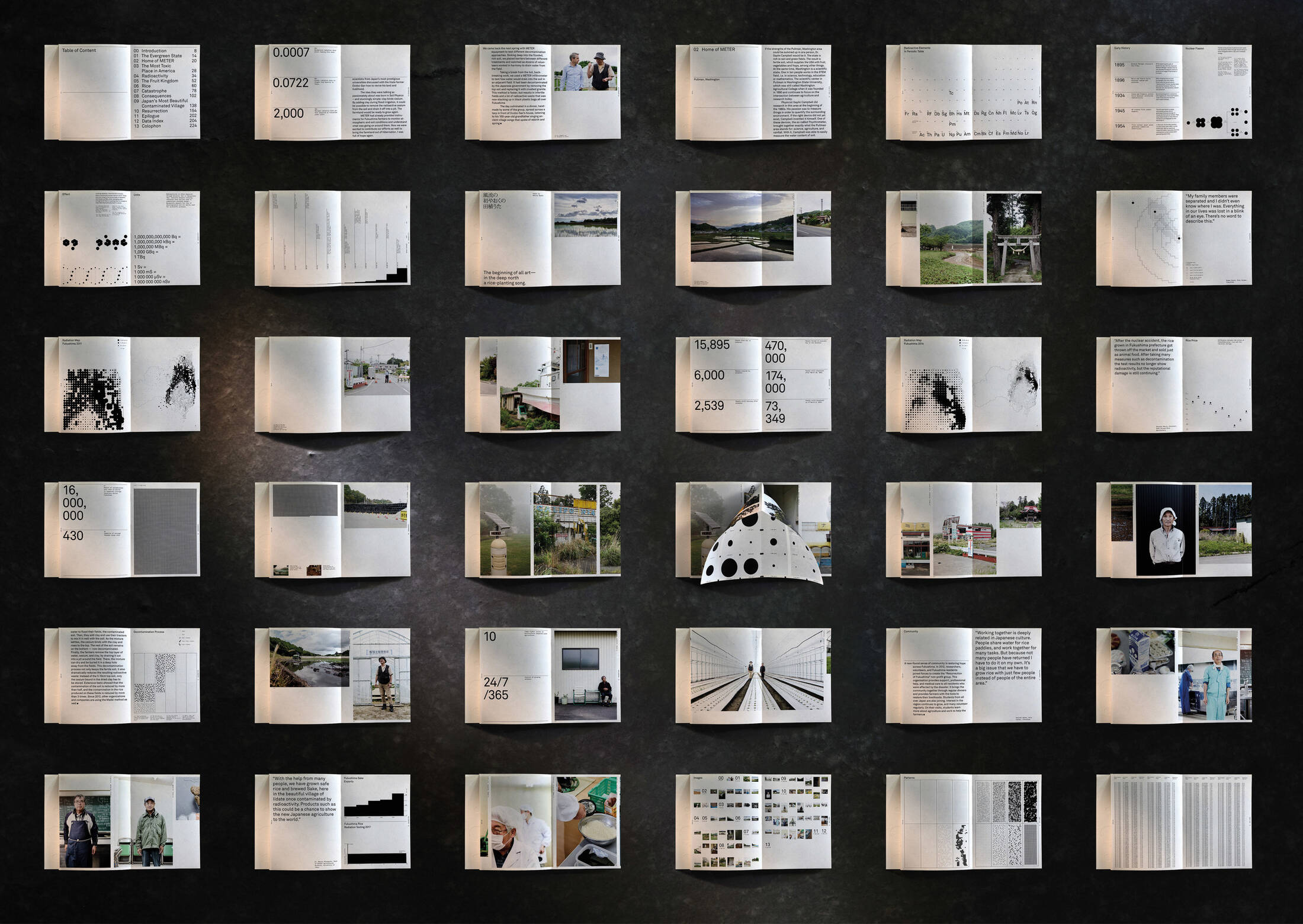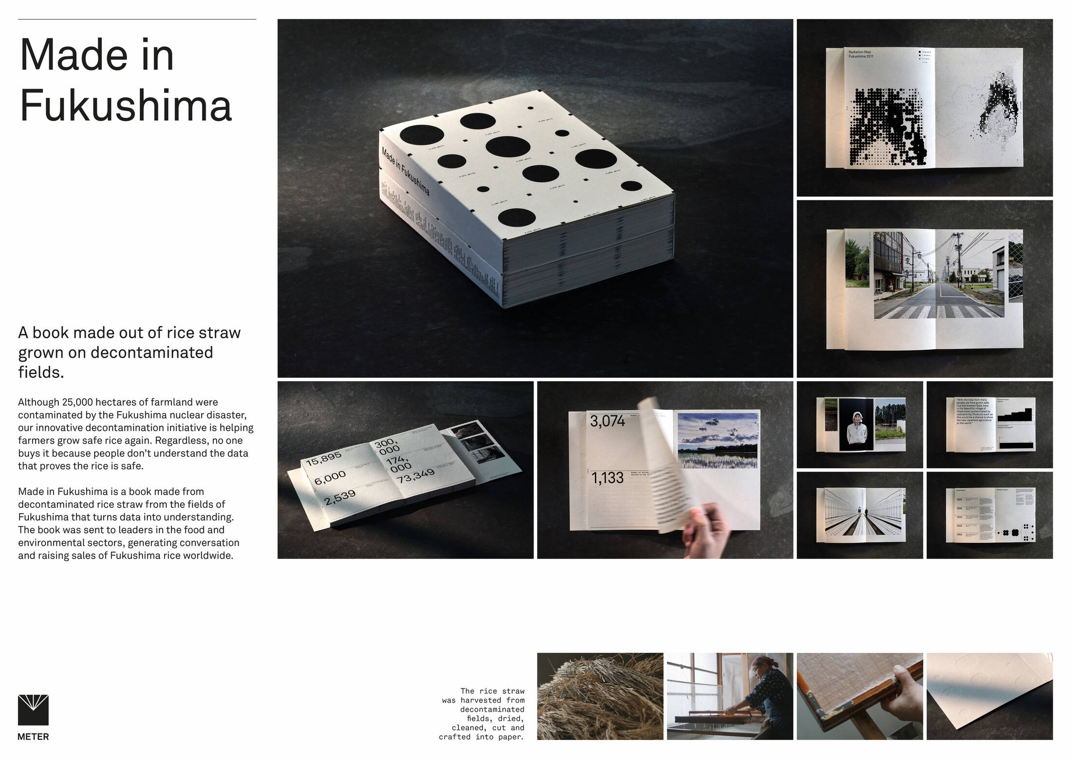 Made in Fukushima is a book made out of rice straw from the decontaminated fields in Fukushima. It helps people understand that the decontamination method works and that the rice from Fukushima is safe, by turning the rice into the medium and the data into understanding. To tell the story, the book uses a wide range of resources: photography, interviews, reports, background information, data and its visualization.