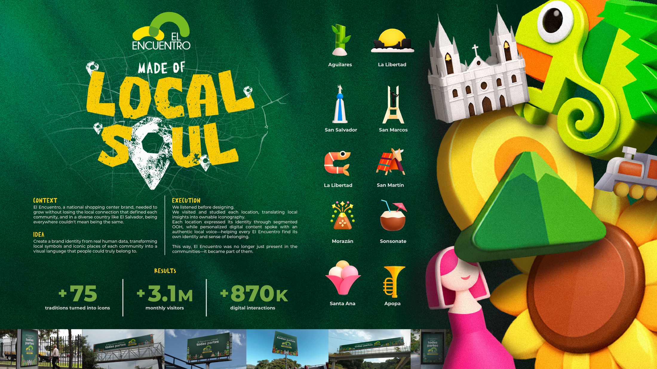 This professional campaign titled 'Made of Local Soul' was published in El Salvador in July, 2025. It was created for the brand: El Encuentro, by ad agency: CREA El Salvador. This Design, OOH Outdoor, and Print media campaign is related to the Other industry and contains 2 media assets. It was submitted about 1 hour ago by Jefe Creativo: Alejandro Alas of FCB Crea El salvador.
