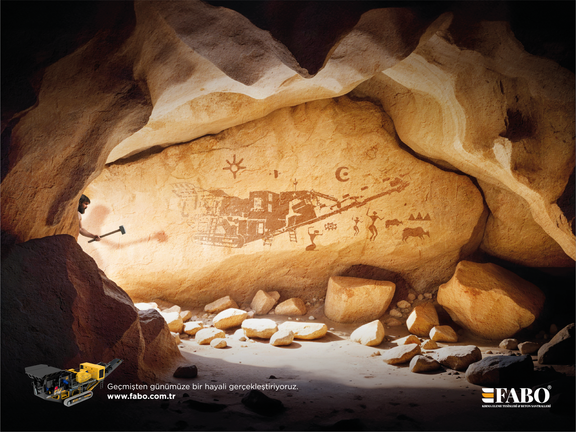 In the creative work we have prepared for FABO, which offers advanced technology solutions to the modern construction and mining sectors by manufacturing stone crushing and screening plants and concrete batching plants, we have brought this historical process together with modern technology. We started from an insight that ancient people developed solutions to overcome the difficulties of stone crushing by using their imagination and perhaps painted these dreams on cave walls. By centering this imagination, we considered the machines produced by FABO with today's technology as a continuation of these creative pursuits of the past.