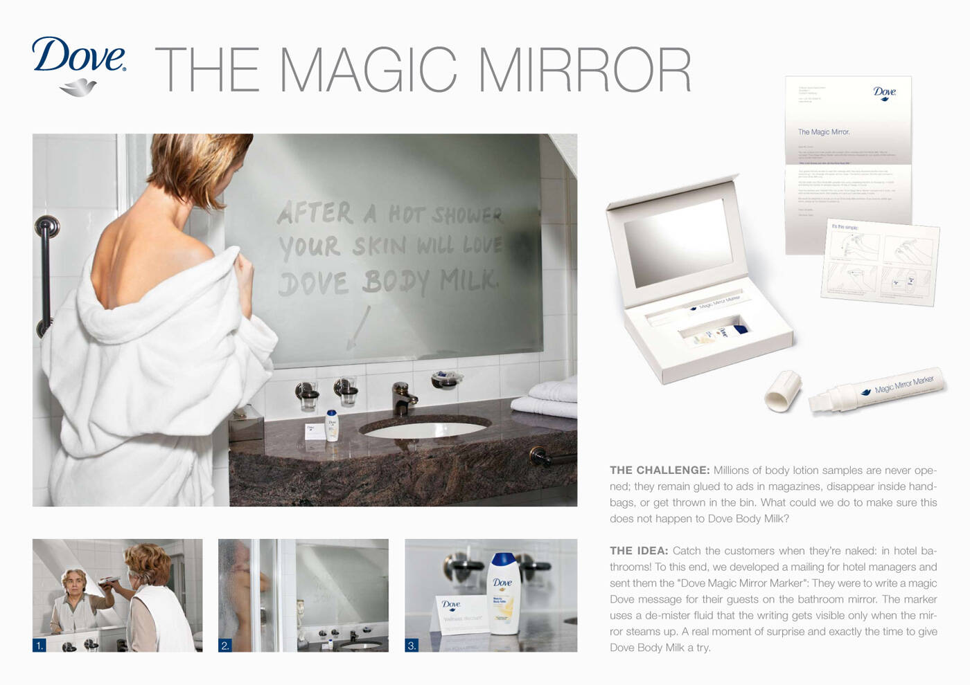 The idea: Catch the customers when they’re naked: in hotel bathrooms! Therefore we developed a mailing for hotel managers and sent them the „Dove Magic Mirror Marker“: They were to write a magic Dove message for their guests on the bathroom mirror. The marker uses a de-mister fluid that the writing appears when the mirror steams up. A real moment of surprise and exactly the moment to give Dove Body Milk a try.