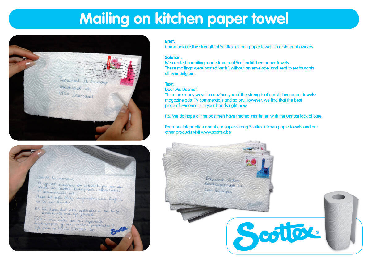Mailing to restaurant owners to promote the strenght of Scottex kitchen roll, on Scottex kitchen roll 'as is'.