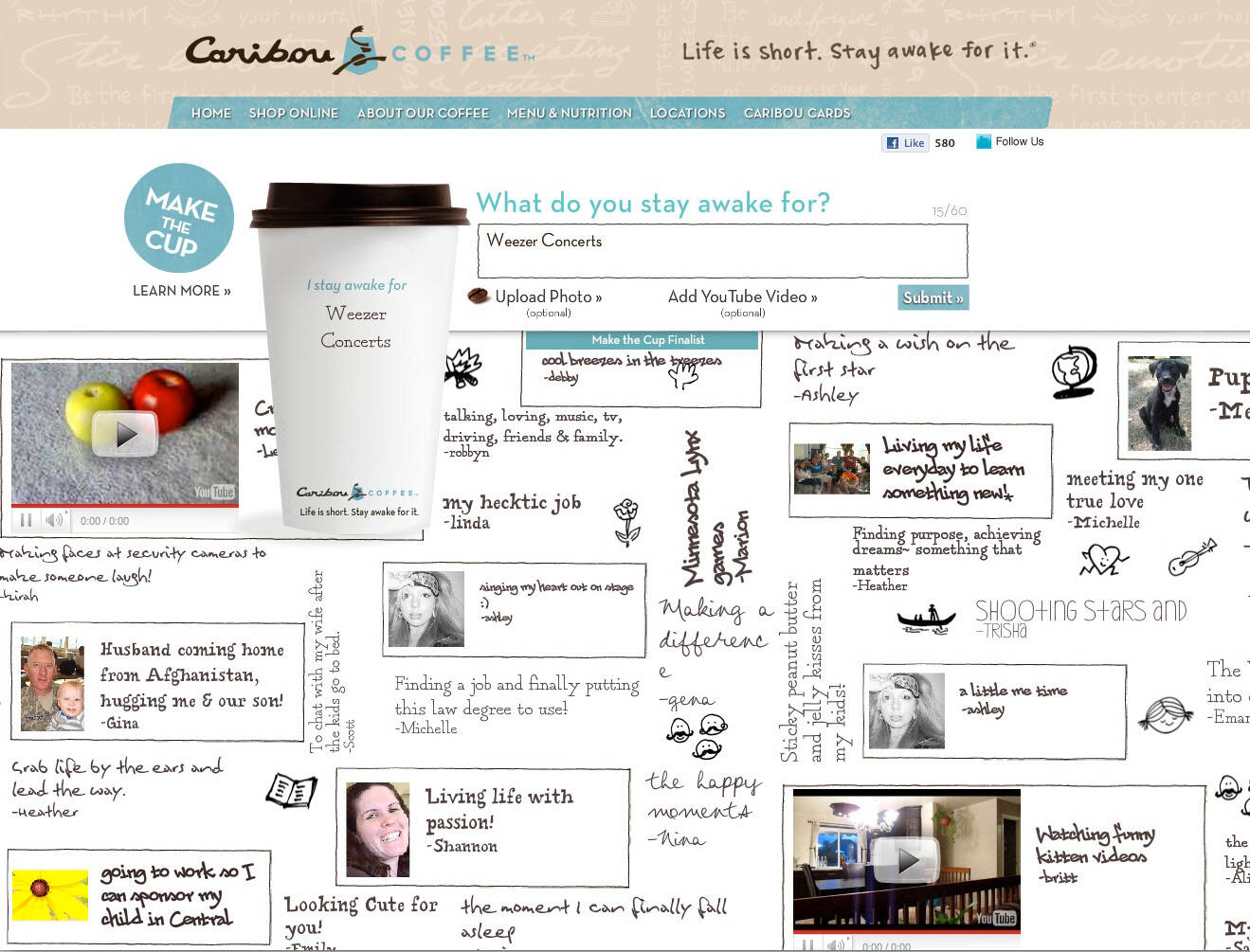 By visiting http://www.makethecup.com, consumers can tell the world what they stay awake for while uploading captions, photos or even videos. Their entries will be posted on the Web page and a few lucky entrants who enter by 9/13 will have their captions featured on Caribou Coffee’s line of 2011 hot and cold coffee cups. The cups will be rolled out to the market during first quarter 2011 in all Caribou Coffee stores.