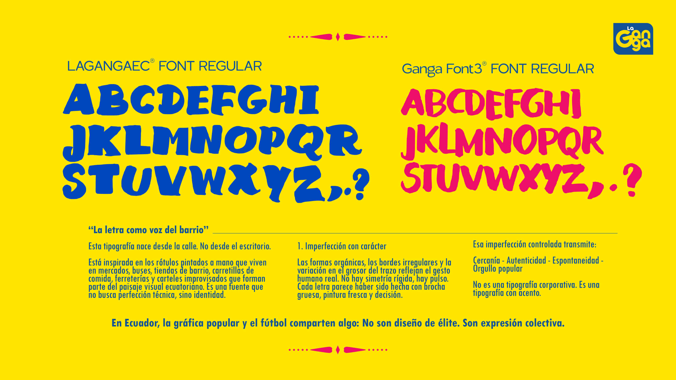 Como parte del proyecto, la marca desarrolló una tipografía propia inspirada en la gráfica popular ecuatoriana: rótulos de barrio, letreros pintados a mano y trapos de estadio. Una letra imperfecta, orgánica y con carácter, que no busca perfección, sino identidad. Así, la canción no solo se canta: también se ve como se vive.