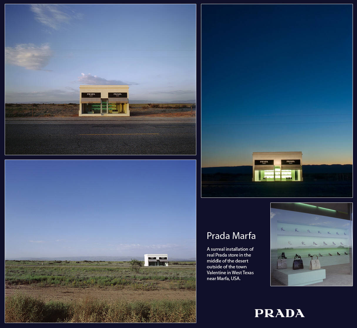 A surreal installation of real Prada store in the middle of the desert outside of the town Valentine in West Texas near Marfa, USA. From the artists: