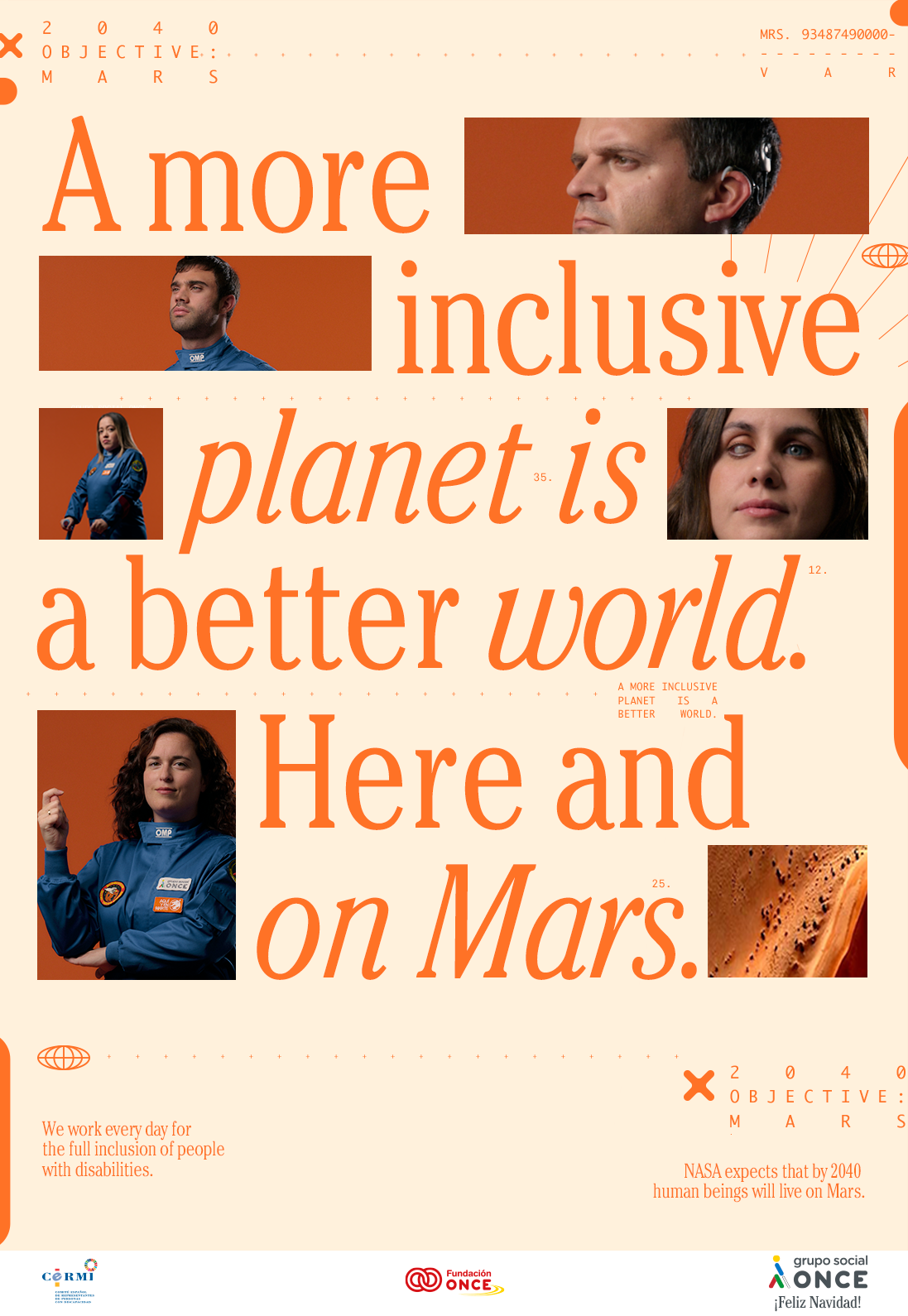 The campaign, developed in collaboration with Ogilvy Spain, is based on the metaphor that if we are about to colonise a new planet, we must do so based on the values that define us as a society. It shows people with disabilities in different settings: at work, in education, in sport and in everyday life, and contrasts the future of Mars with the present on Earth, showing people with disabilities fully integrated.