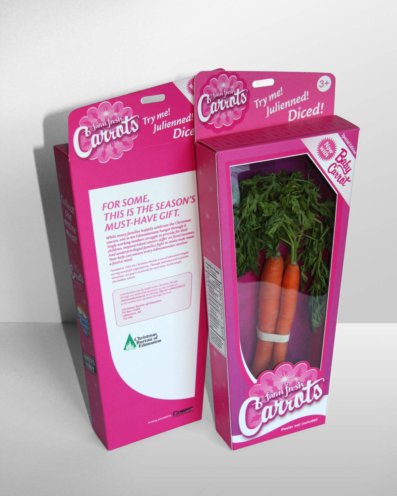 During the holidays - while most children are pleading with their parents for the season's newest toy - the Christmas Bureau of Edmonton tries to feed the thousands of hungry children in the city who want nothing more than a decent meal. To help garner donations, Calder Bateman designed and produced custom "toy boxes" for carrots and potatoes, and sent them out to philanthropists and the city's major donors during the Christmas period - reminding them that for some children, these are the season's must-have gifts.