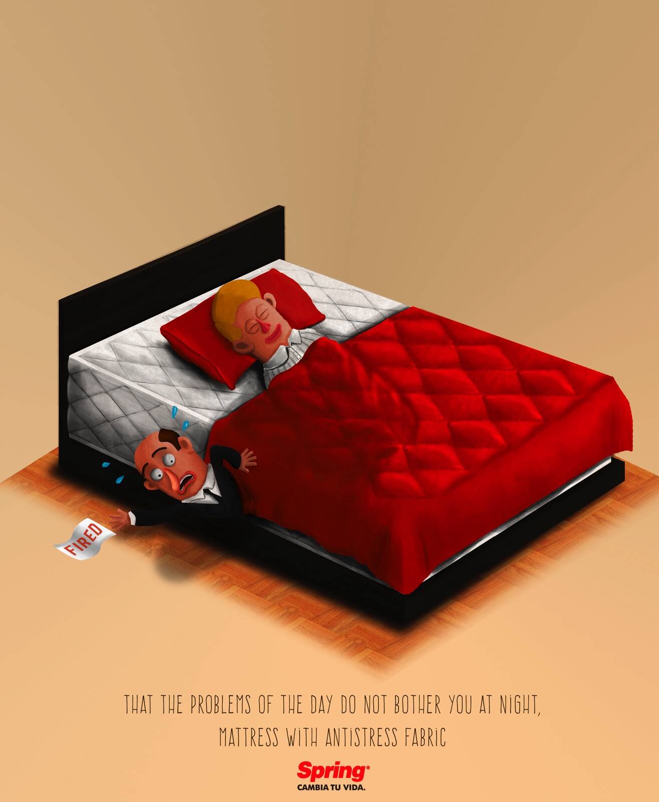 This professional campaign titled 'Mattress with Antistress Fabric' was published in Colombia in May, 2018. It was created for the brand: Spring, by ad agency: McCann. This Print medium campaign is related to the House, Garden industry and contains 2 media assets. It was submitted over 7 years ago.