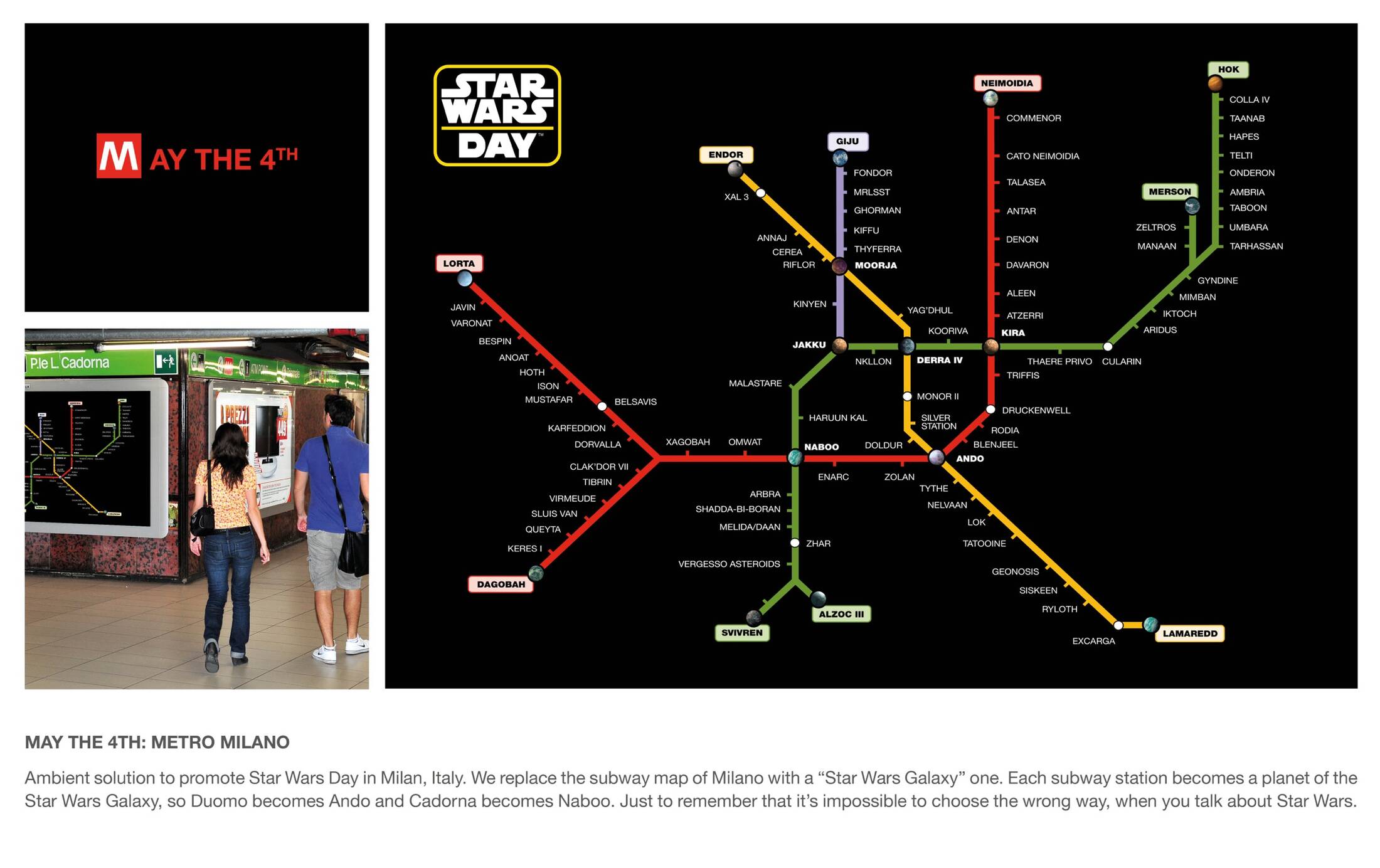 This professional campaign titled 'MayThe4th' was published in Italy in May, 2015. It was created for the brand: Star Wars, by ad agency: Invasione Creativa. This OOH Outdoor medium campaign is related to the Media industry and contains 1 media asset. It was submitted over 10 years ago.