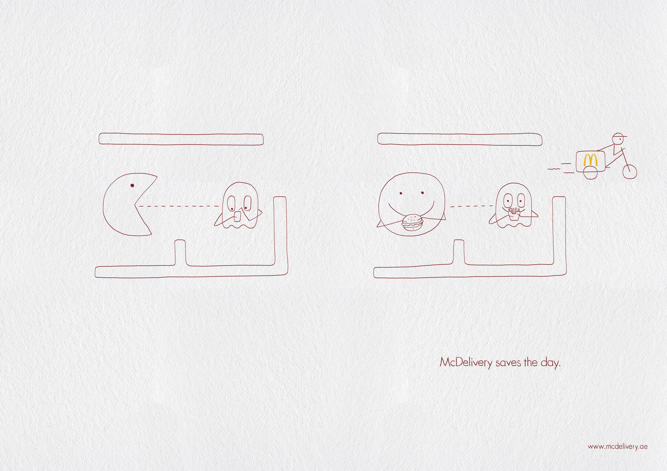 A series of simple images created to demonstrate in a humorous way different situations in which McDelivery can save your day.