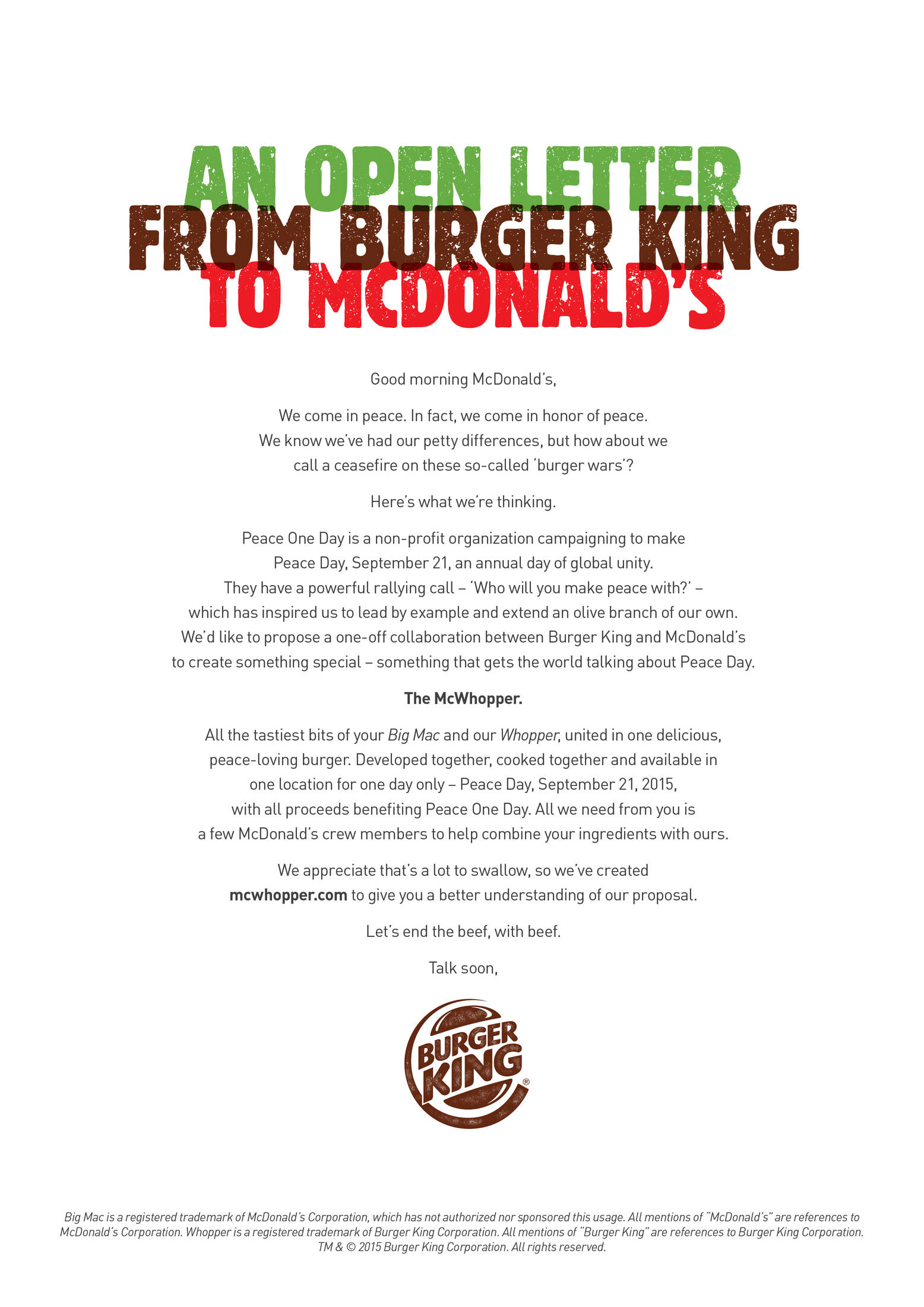 It's official. Burger King is extending an olive branch to McDonald’s, calling for a one-day ‘burger wars’ ceasefire on their longstanding rivalry. Burger King proposes that on Peace Day, September 21st, 2015, the two restaurants set aside their differences and unite to create the ‘McWhopper’ - a burger that combines all the tastiest ingredients from their signature sandwiches, the Big Mac® and the WHOPPER®, in one delicious, peace-loving burger. A detailed exploration of Burger King’s proposal to McDonald’s can be found at www.mcwhopper.com. The ‘McWhopper’ would be available for one-day, at one location in Atlanta, Georgia, U.S.A, with the objective of raising awareness of Peace Day. As with any proposal, McDonald’s is free to accept or decline the offer. If they choose not to participate, no harm done - after all, peace isn’t always easy to achieve. Should they say yes, burger fans will get to experience the culinary mash-up of a lifetime, and walk away inspired by the mouthwatering taste of peace. Peace Day, September 21st, is a United Nations-recognized annual day of global unity, successfully advocated by the non-profit organization Peace One Day.