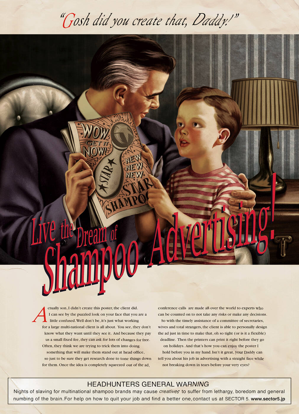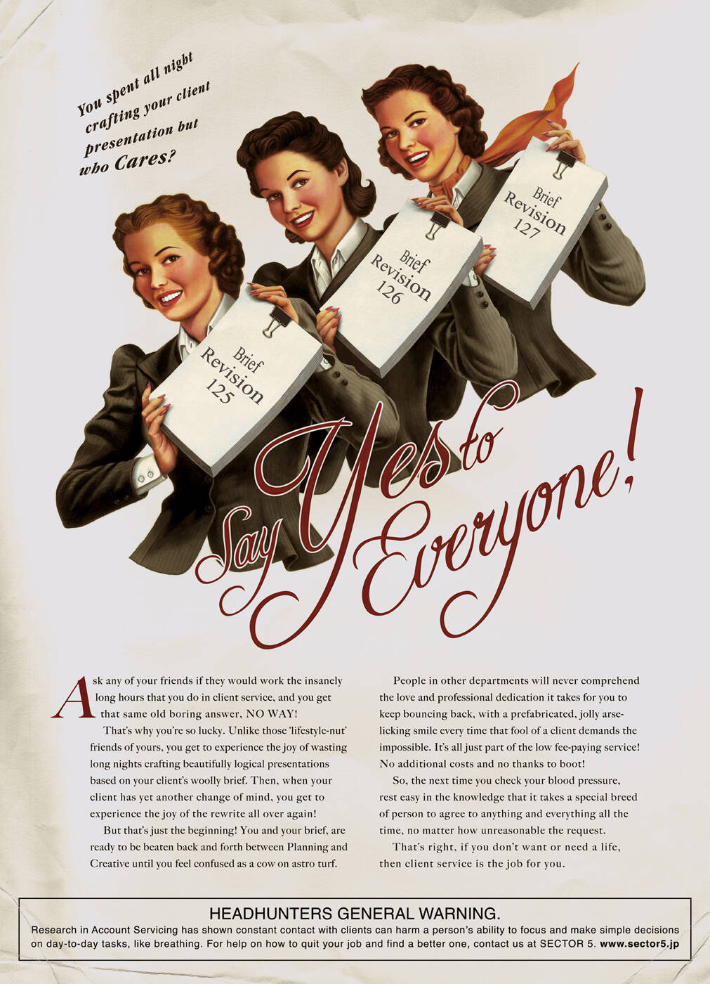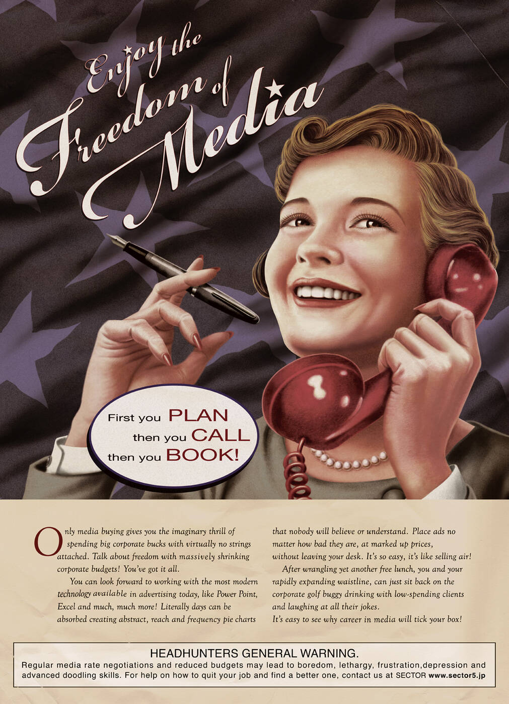 This professional campaign titled 'Media, Client Service, Creative' was published in Japan in November, 2007. It was created for the brand: Sector 5 Recruitment, by ad agency: JWT. This Print medium campaign is related to the Professional Services industry and contains 3 media assets. It was submitted over 17 years ago.