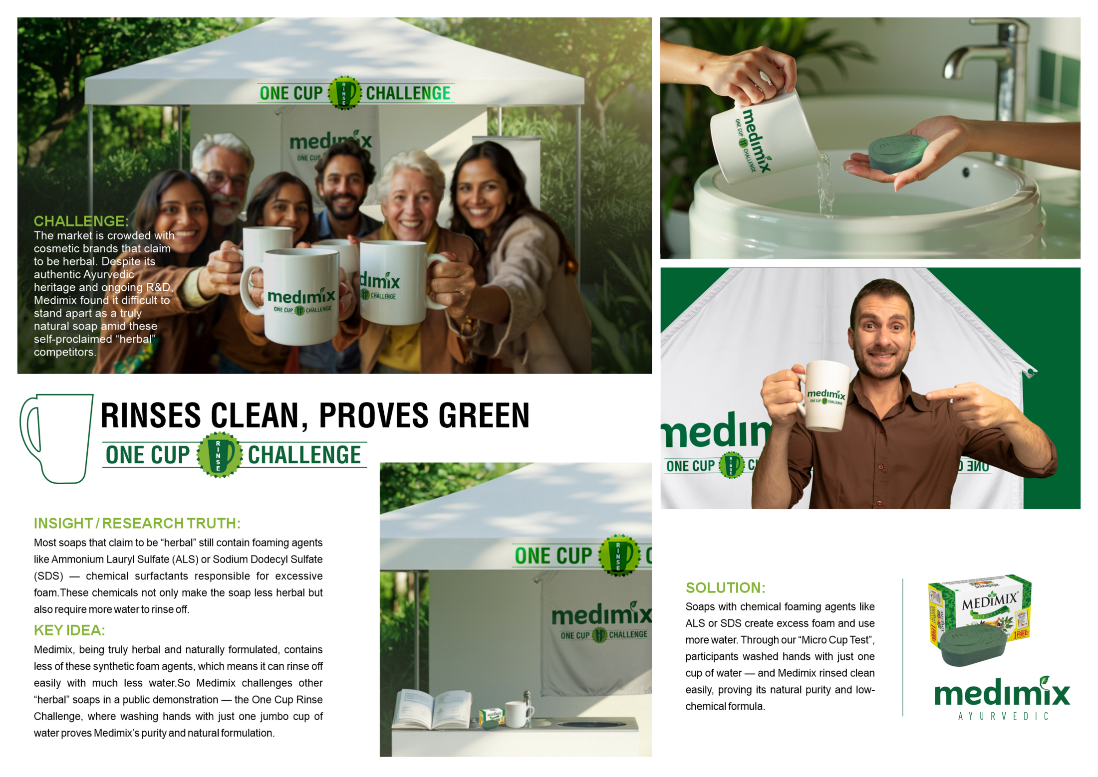Medimix challenged the market’s “herbal” soaps through the One Cup Challenge — a live test proving that its pure herbal formulation rinses clean with just one cup of water, demonstrating that fewer chemicals mean less water use.