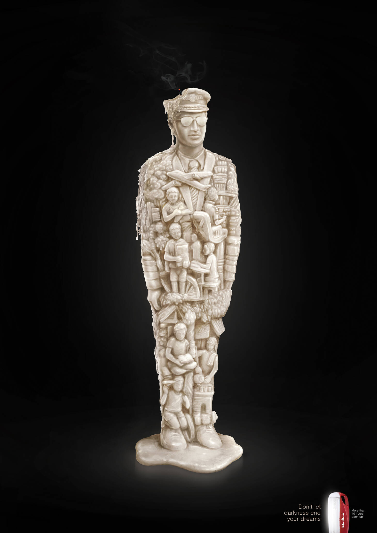 Power-cuts are a big problem in India. Rural India faces long hours of power-cuts, daily. As the darkness takes away study times dreams melt away like burning candles. So, we commissioned a sculptor to create a candle that was 2 feet long and 6 inches in diameter. Carved along the body of the candle was the various life stages that the kid would go through to become a pilot or a doctor. And then we lit it up. The melting candle became our ad for the emergency lamp.