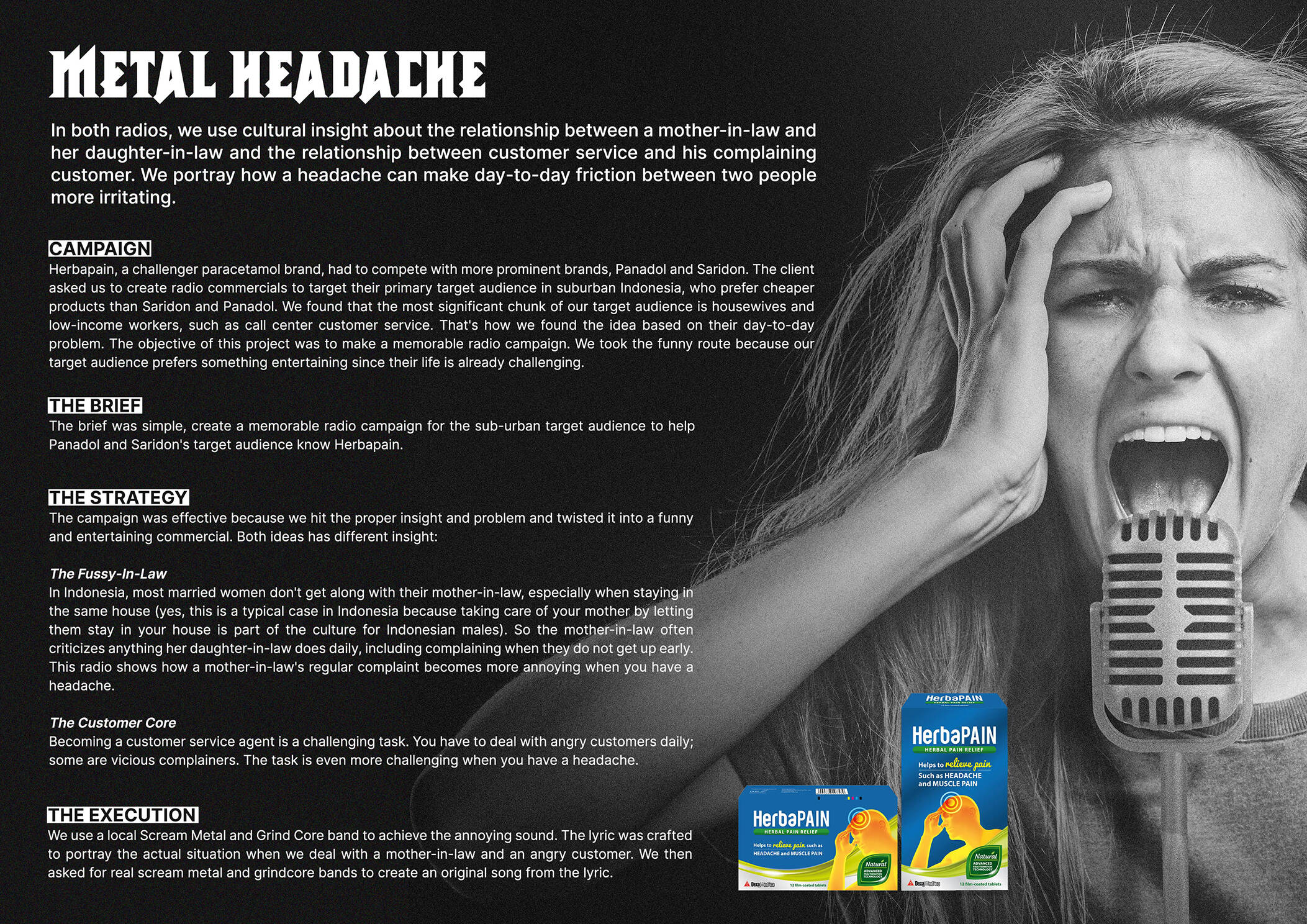 This professional campaign titled 'METAL HEADACHE' was published in Indonesia in October, 2022. It was created for the brand: Herbapain, by ad agency: Popcult Group. This Audio medium campaign is related to the Health industry and contains 4 media assets. It was submitted over 1 year ago by Arif Kurniawan of Popcult Group.